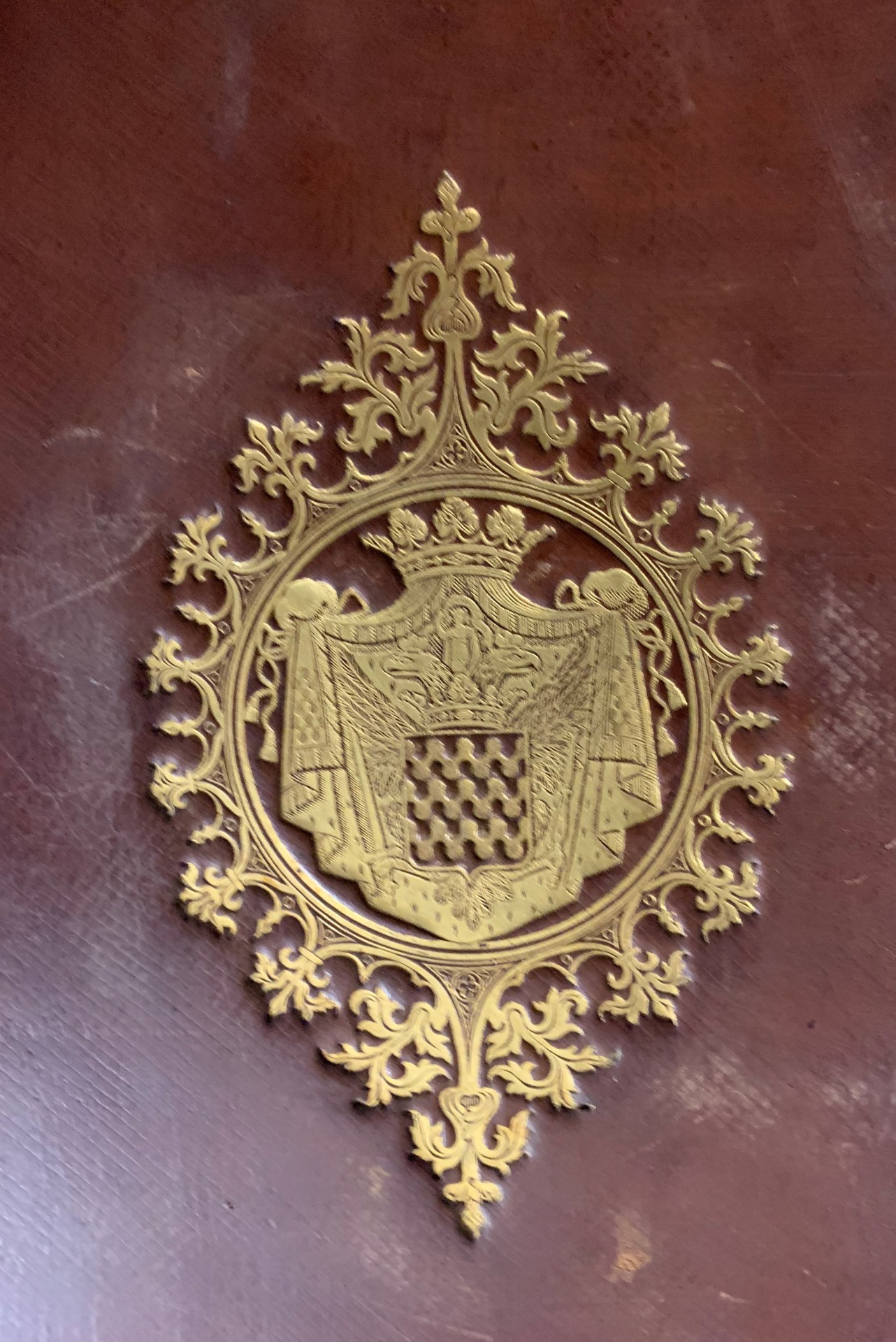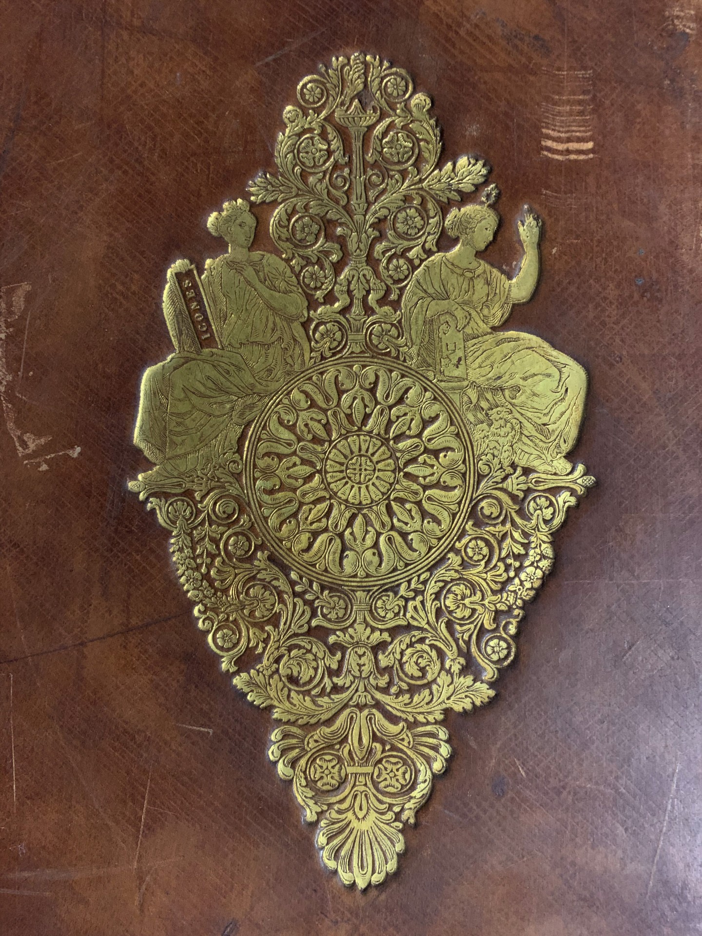 L’exemplaire conservé à la bibliothèque universitaire se distingue par une somptueuse reliure en cuir décorée d’encadrements dorés à motifs végétaux alternés de motifs à froid. Le plat inférieur montre les armes de la maison de Bauffremont* [fig. 2]. Au milieu du plat supérieur se trouve un grand fleuron avec deux figures allégoriques [fig. 3]. À gauche, une figure féminine tient dans la main un livre portant le titre « Icones », et à droite une autre figure coiffée d’une étoile et accompagnée d’un rapace, montre dans la main un livre fermé par des charnières. Si leurs attributs permettent de les identifier comme allégories de la Mémoire et de l’Ingenium, les détails qui contrastent avec l’iconographie traditionnelle et notamment, l’inscription « Icones » sur la tablette de la Mémoire et le livre ancien dans les mains de l’Ingenium, suggèrent de considérer ces figures mystérieuses comme personnifications respectivement de l’Anatomie moderne qui fonde sa pratique sur les « images » en tant qu’instrument, et de l’Anatomie ancienne basée sur la tradition philosophique.