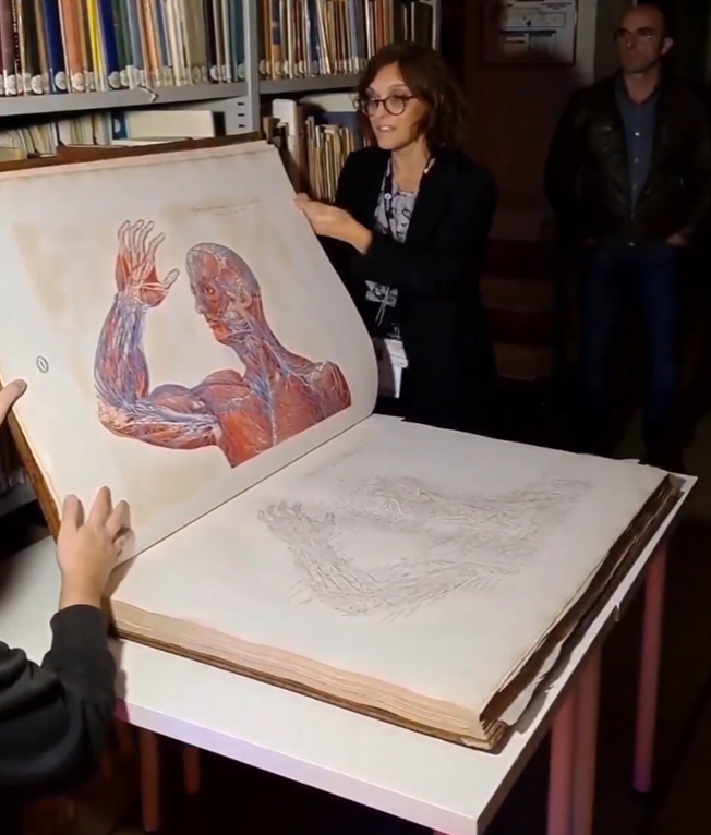 L’auteur de cet atlas est Paolo Mascagni, médecin et anatomiste italien, qui a consacré les trente dernières années de sa vie à la réalisation de cette œuvre extraordinaire pour son inspiration et son format. Afin de perfectionner l’illustration et de rendre l’image plus réaliste, Mascagni a exigé l’emploi de la technique lithographique en couleur qui était, à cette époque, une véritable nouveauté. Le clair-obscur souligne la structure et la profondeur des tissus, tandis que les couleurs conventionnelles (rouge écarlate pour les artères, bleu pour les veines, blanc pour les nerfs et les vaisseaux lymphatiques) donnent du relief à cette trame organique de « fils » qui habille la sinuosité des muscles [fig. 1].
