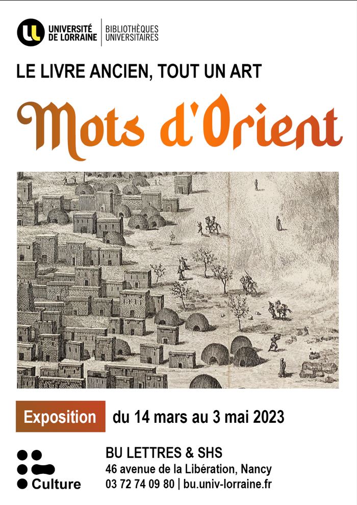 L’exposition Mots d’Orient est organisée par la mission Patrimoine des BU de Lorraine, en collaboration avec le laboratoire ATILF (Analyse et Traitement Informatique de la Langue Française). Elle accompagne le colloque international « Typologies de l’islam occidental dans les dictionnaires, les encyclopédies et les lexiques européens aux XVIIIe et XIXe siècles » qui se tient à la BU Lettres & SHS de Nancy, du 16 au 17 mars 2023.
