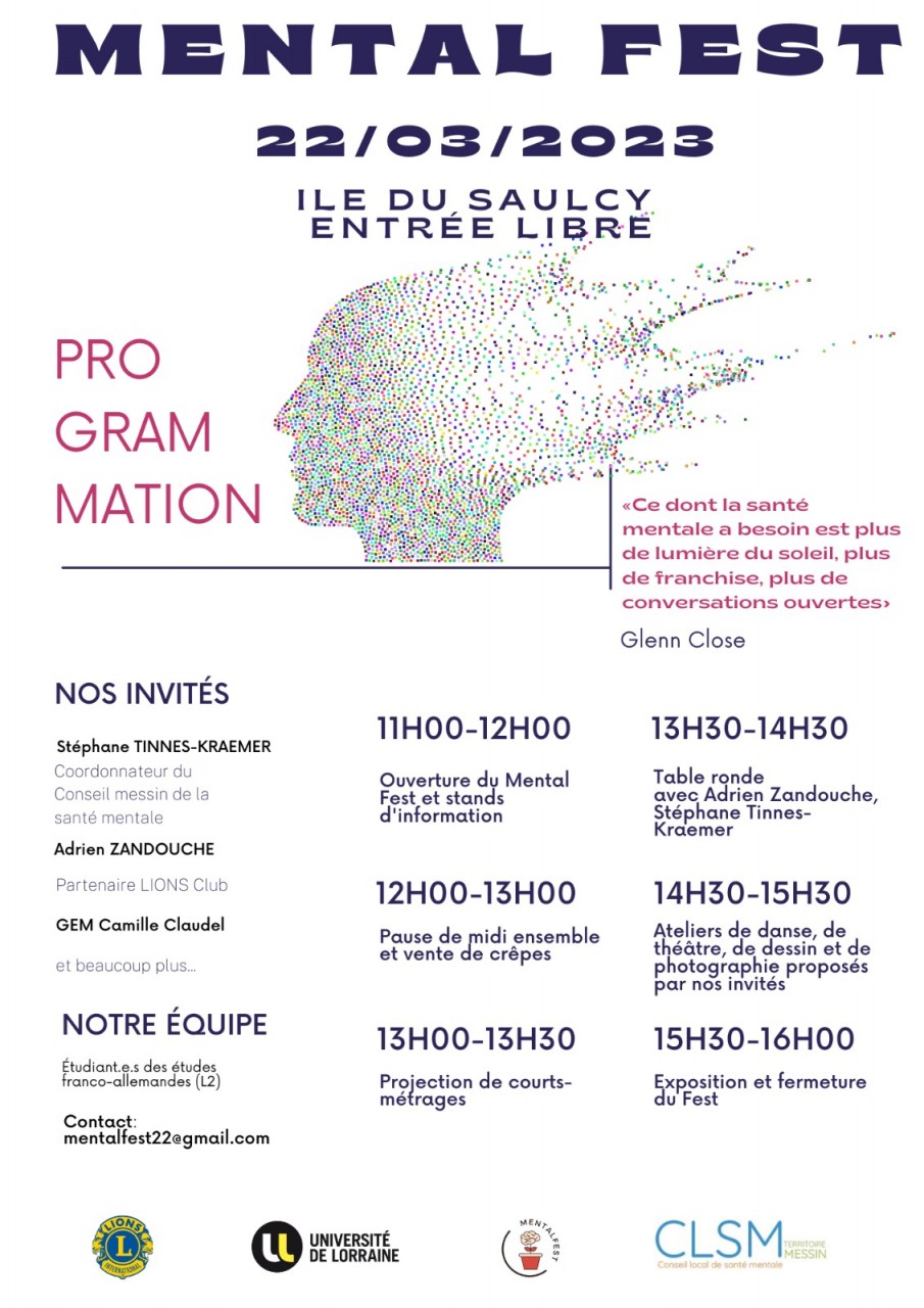 Il s'agit tout simplement d'une journée, le mercredi 22 mars, où des professionnels de la santé mentale, des psychologues, des infirmières et tant d'autres encore, interviendront à travers divers stands et ateliers (tel que d'écriture, de danse, table ronde, photographie, et pleins d'autres encore) pour informer sur ce sujet, sensibiliser et apporter des solutions, des aides.
