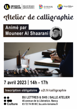 Dans le cadre des JACES 2023, la bibliothèque universitaire de Lettres, Sciences humaines et sociales de Nancy accueille un atelier d’initiation à la calligraphie arabe, le vendredi 7 avril 2023 de 14h à 17h, à l’occasion de la venue de l’artiste calligraphe Mouneer Al Shaarani.