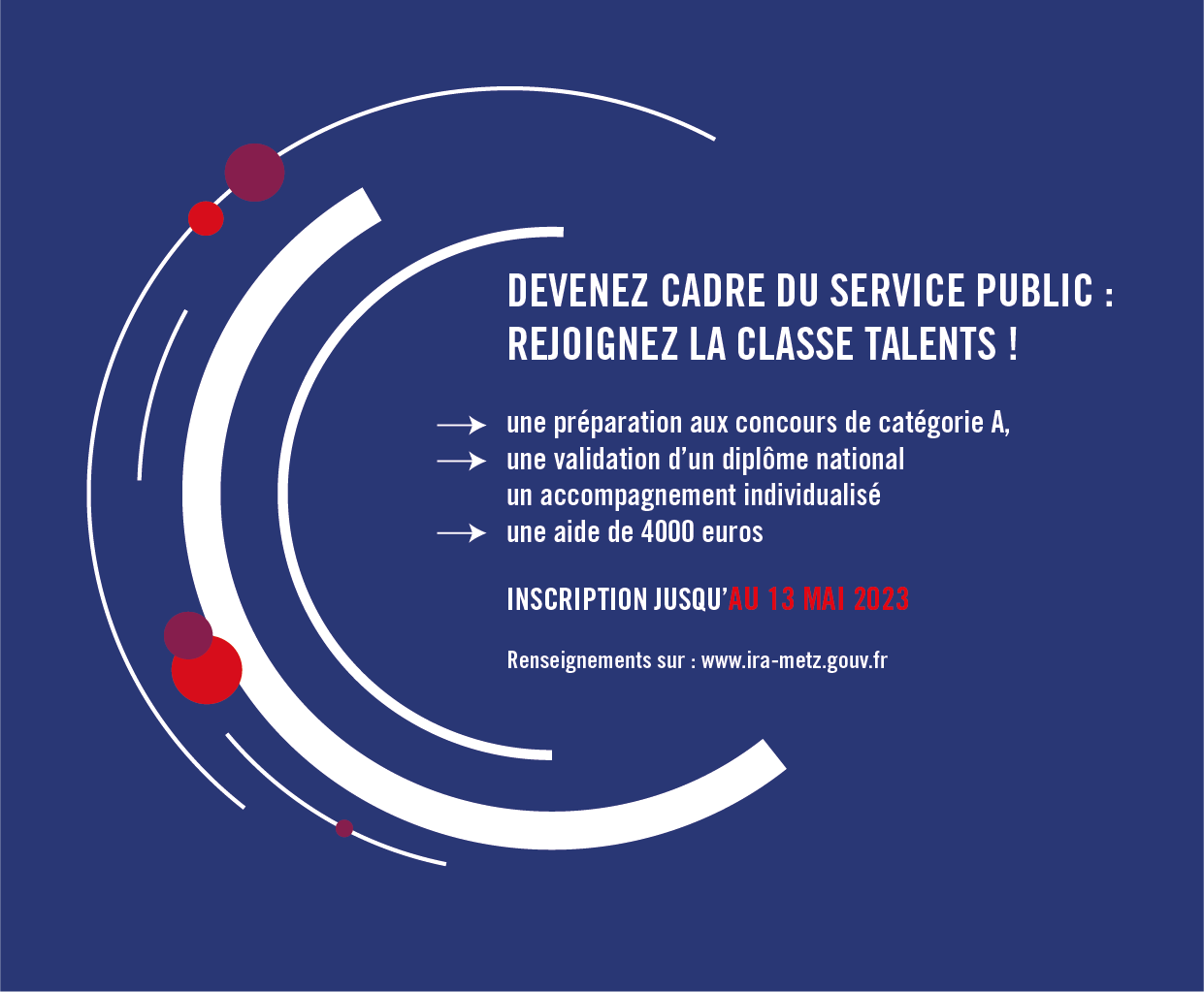 La classe Talents Lorraine est un dispositif « égalité des chances » destiné à offrir une préparation efficace aux concours de catégorie A (emploi de cadres de la fonction publique) tout en validant un diplôme au sein de l’Université de Lorraine. Les étudiants sont donc inscrits dans l’un des diplômes nationaux proposés, de niveau licence ou master ou une préparation externe non diplômante, tout en bénéficiant d’un parcours spécifique « Classe Talents Lorraine ».