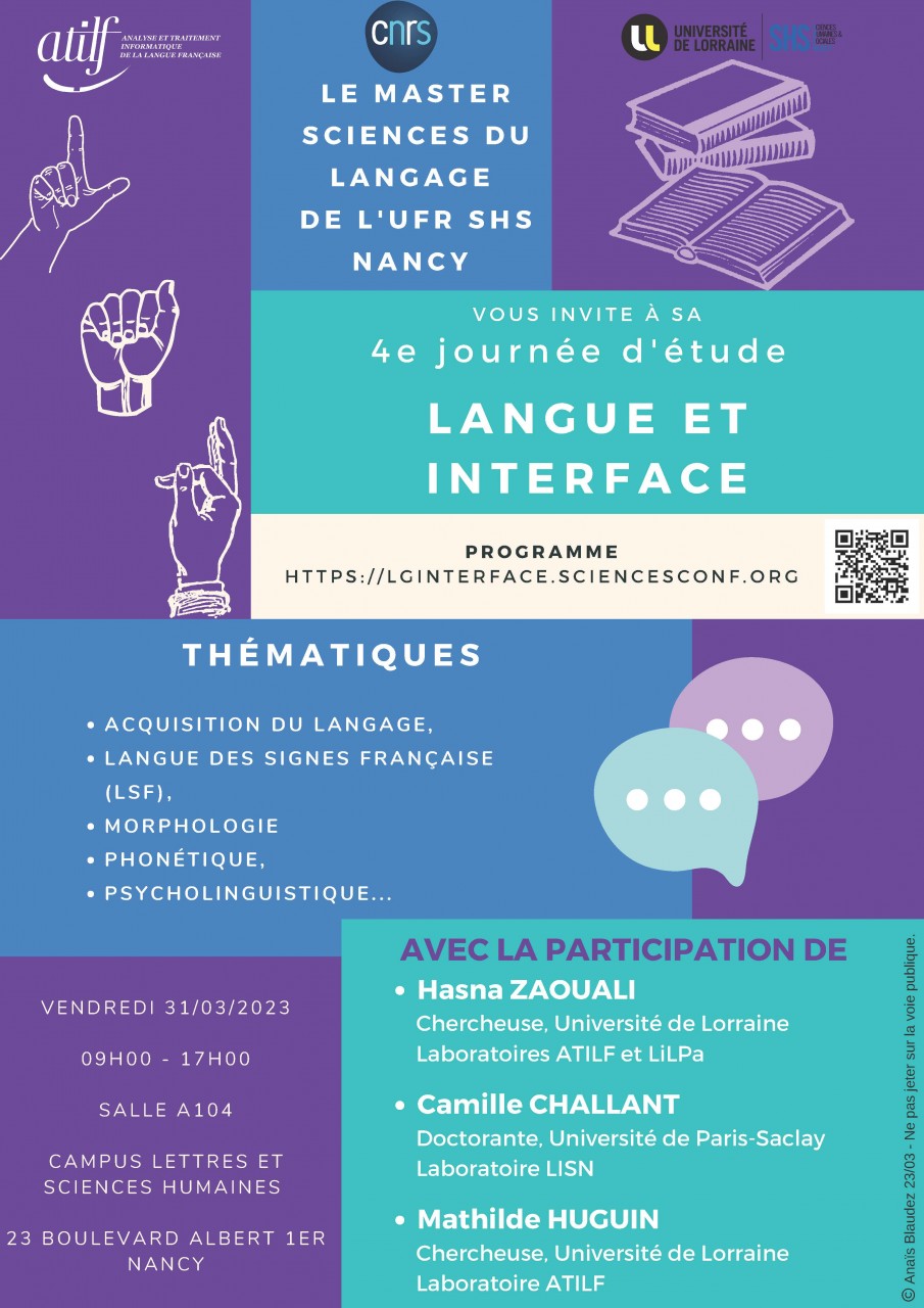 Les étudiant·e·s du master Sciences du Langage – Analyse et Traitement du Lexique de l’UFR SHS à Nancy vous invitent à la 4e édition de leur Journée d’études sur le thème "Langue et Interface".