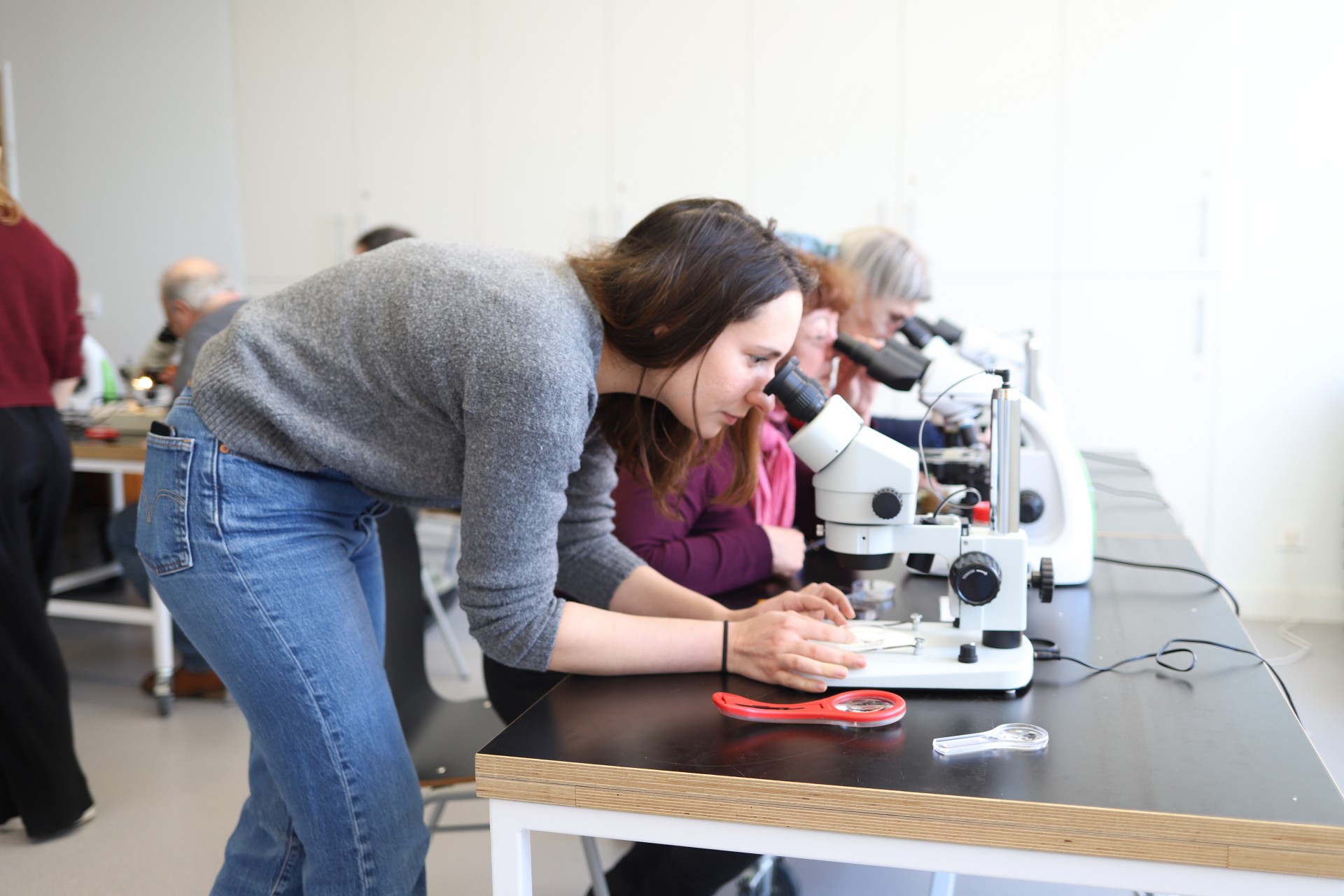 La seconde partie de la visite : un atelier durant lequel toutes et tous ont pu apprendre à observer aux microscopes divers parasites, rampants, volant, nageant.