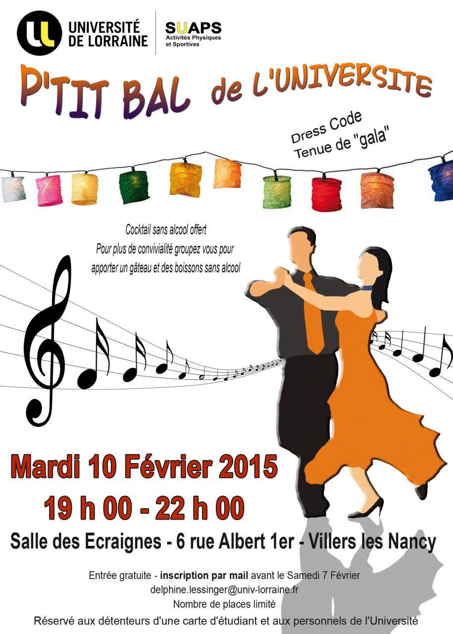 Mardi 10 février 2015, une soirée P’tit bal » accueillera les étudiants et personnels de l'Université de Lorraine de 19 heures à 22 heures à la salle des Ecraignes, 6 rue Albert 1er à Villers les Nancy.