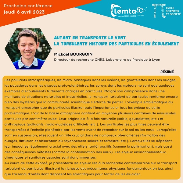 La prochaine conférence sera donnée par Mickaël BOURGOIN, directeur de recherche CNRS au Laboratoire de Physique à Lyon :