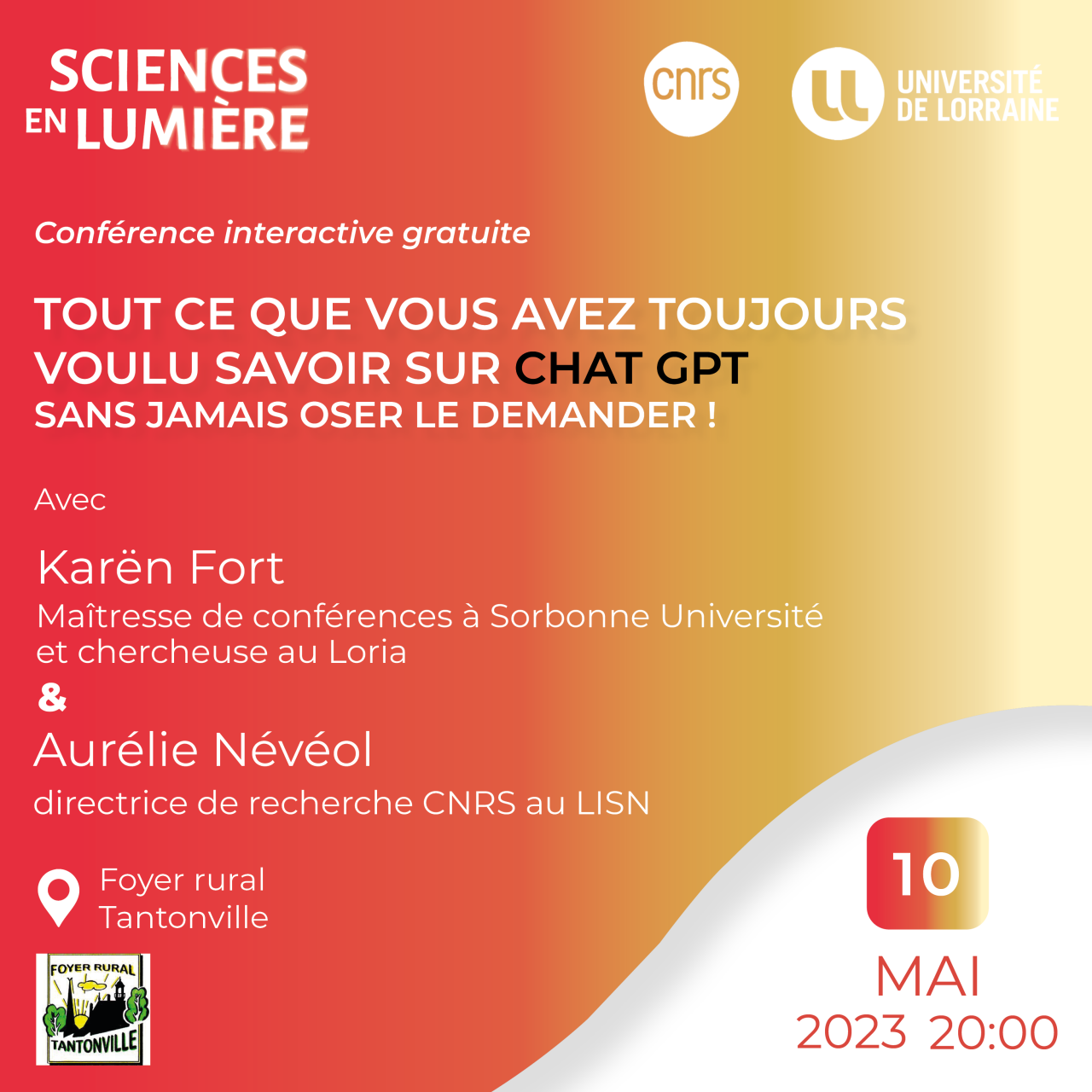Assitez à une conférence interactive en présence de Karën Fort, maîtresse de conférences à Sorbonne Université et chercheuse au laboratoire LOrrain de Recherche en Informatique et ses Applications - LORIA (CNRS, Inria, Université de Lorraine) et Aurélie Névéol, directrice de recherche CNRS au Laboratoire Interdisciplinaire des Sciences du Numérique - LISN (CNRS/Université Paris-Saclay)