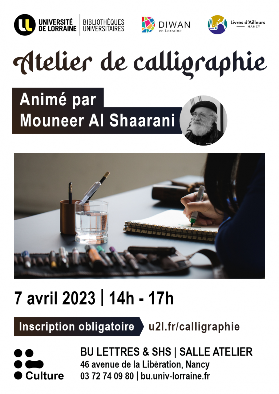 Dans le cadre des JACES 2023, la bibliothèque universitaire de Lettres, Sciences humaines et sociales de Nancy a accueilli un atelier d’initiation à la calligraphie arabe, le vendredi 7 avril 2023 de 14h à 17h, à l’occasion de la venue de l’artiste calligraphe Mouneer Al Shaarani.