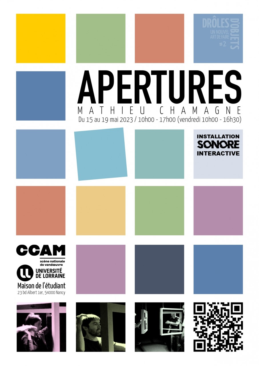 Mathieu Chamagne invente des expériences singulières et immersives aux frontières de la création sonore et de l’art numérique. Apertures est une sculpture sonore interactive. Trois cadres sont suspendus, comme autant de points de vue sur un même paysage sonore. Il ne reste plus alors qu’à y plonger pour pétrir la musique. Les gestes les plus infimes sont captés et modulent la matière sonore. Chacun devient l’interprète de sa propre perception et de son écoute, laissant libre cours à son imagination. Apertures est une expérience sensible à vivre sans restriction.