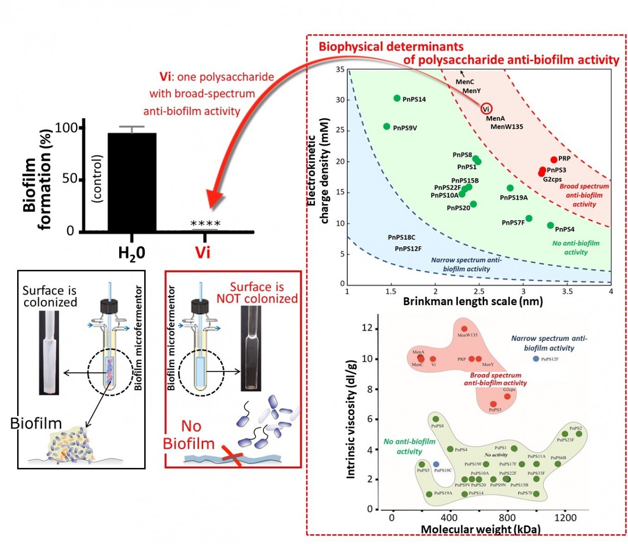 Figure 1. Classification de polysaccharides bactériens capsulaires selon leur activité anti-biofilm en fonction de leurs propriétés électrocinétiques et viscosimétriques (spectre d’action large: zone rouge dans les deux panels de droite; spectre d’action réduite: zone bleue; pas d’action: zone verte).