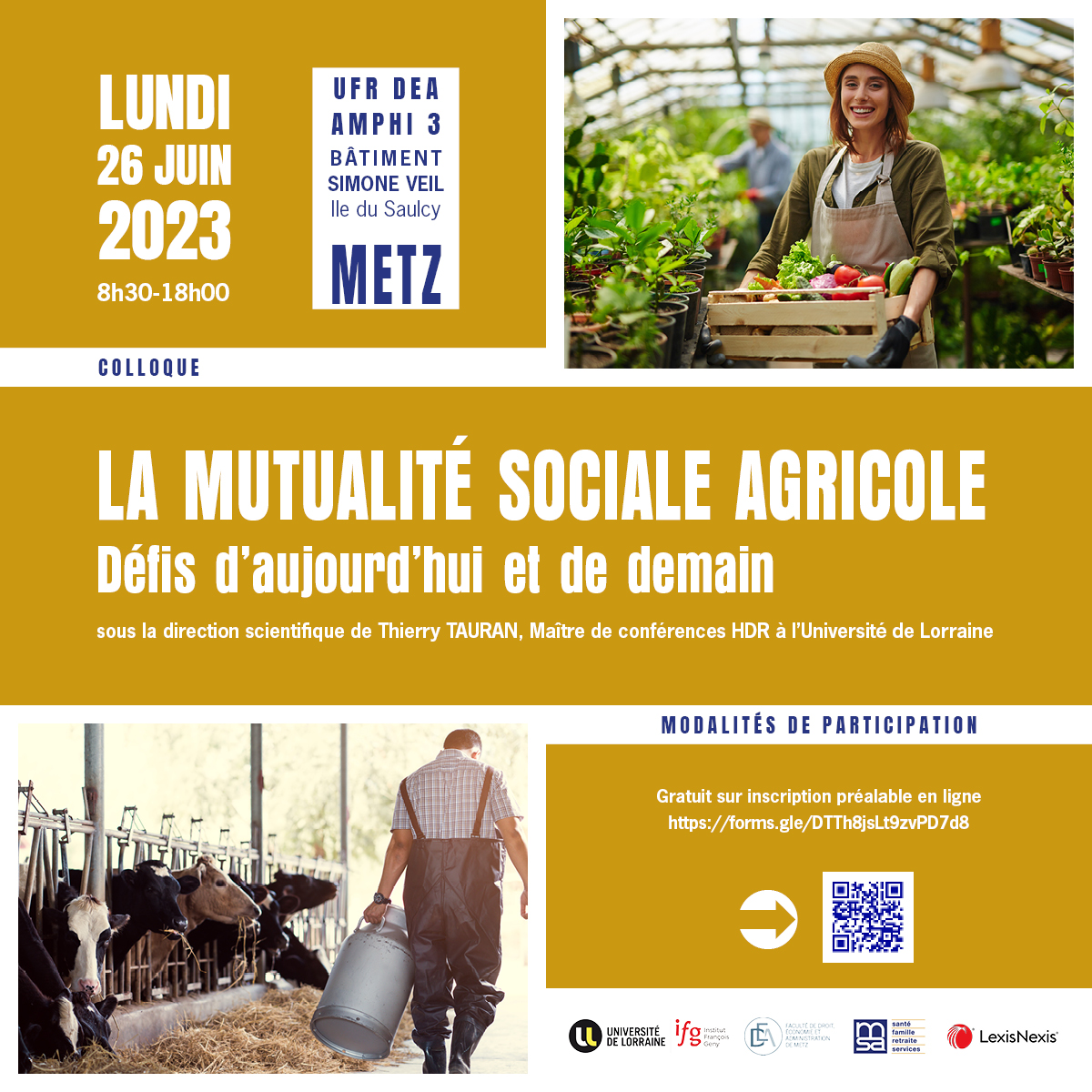 Ce colloque est organisé sous la direction scientifique de Thierry Tauran, maître de conférences HDR à l’Université de Lorraine, avec les interventions notamment de Pascal Cormery, Président du conseil d’administration de la Caisse centrale de MSA, de François-Emmanuel Blanc, Directeur général de la Caisse centrale de MSA, et de Jean-Yves David, Conseiller à la 3ème Chambre civile de la Cour de cassation. Il bénéficie du soutien de l'Institut François Gény (Université de Lorraine), de la collaboration de la Faculté de Droit, Économie et Administration de Metz (Université de Lorraine) ainsi que de la Revue Droit rural (LexisNexis) qui accueillera les actes du colloque, et de la participation de la Mutualité Sociale Agricole.