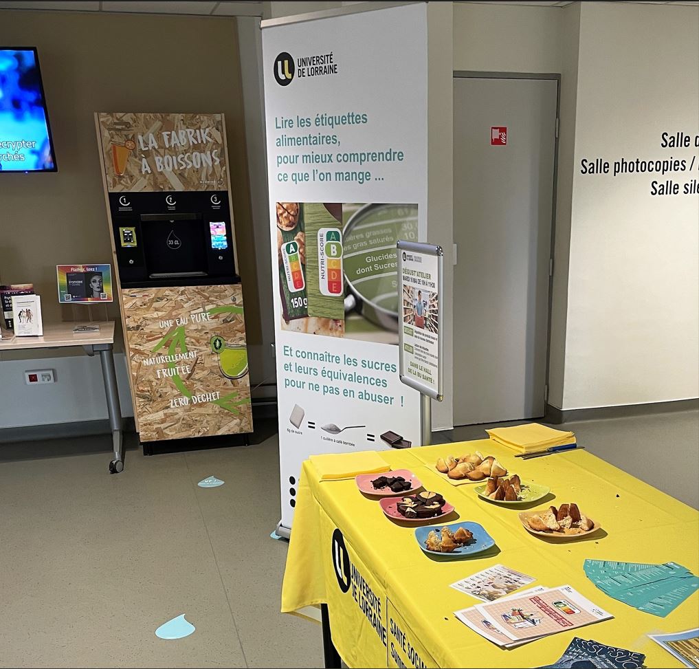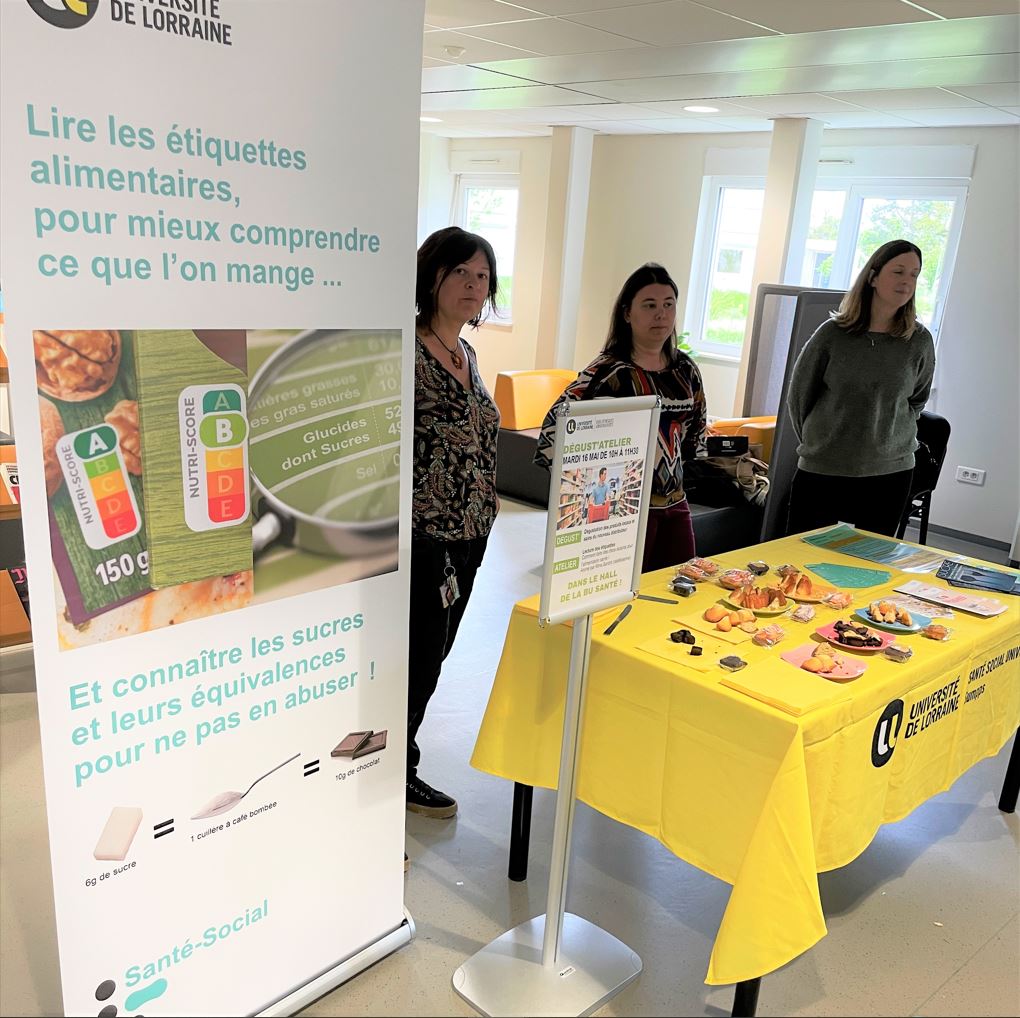 Le 16 mai dernier, à l’occasion de l’inauguration d’un nouveau distributeur de produits locaux à la Bibliothèque Universitaire Santé (Vandœuvre-lès-Nancy), Aurélia Bardot, diététicienne du Service de Santé, accompagnée de Roxane Cherrier, infirmière, ont animé un atelier « Lecture d’étiquettes alimentaires ».