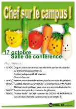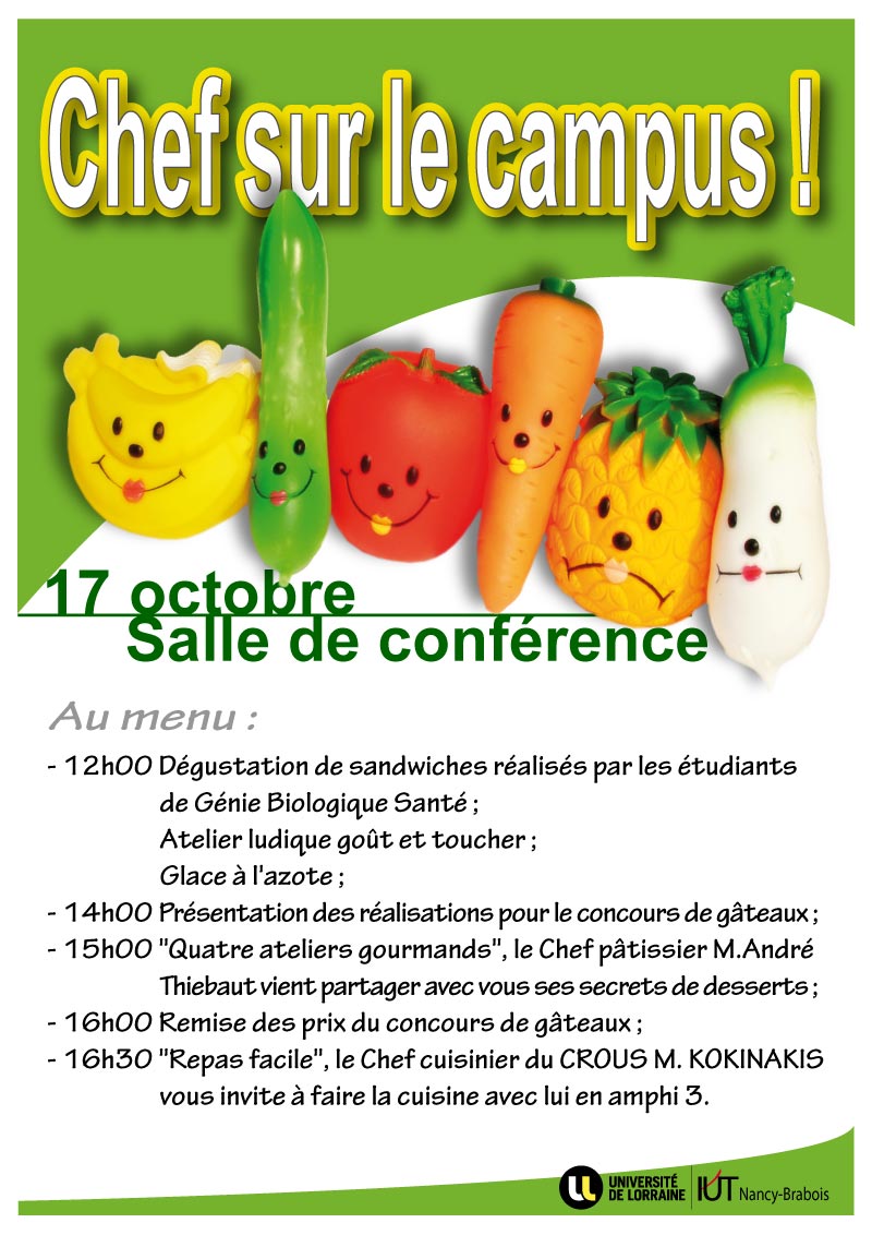Au menu du jeudi 17 octobre après-midi, des animations culinaires auxquelles tout le personnel est invité à participer. Les associations étudiantes ont choisi de stimuler le génie culinaire estudiantin en montant un concours de gâteaux et en produisant des glaces à l’azote. A midi, les étudiants en diététique du Département Génie Biologique Santé proposeront une gamme de sandwichs équilibrés, avec recettes à l’appui, pour démontrer qu’une alimentation rapide peut allier goût et santé. A 15h, en amphithéâtre et sous les yeux du public, M. André Thiébaut, pâtissier nancéen, animera quatre ateliers de customisation culinaire de produits courants (crêpes, pancakes, cake, pain d’épice) puis, à 16h30, M. Kokinakis, chef cuisinier du CROUS de Vandoeuvre, préparera un plat économique et complet à base de poulet.