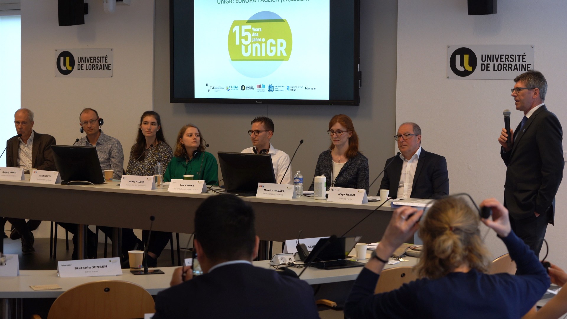 « Un groupement universitaire transfrontalier visionnaire qui a développé un modèle d'université européenne ; un groupement qui poursuit et renouvelle continuellement sa coopération en matière d'enseignement, de recherche et de promotion des futurs chercheurs. », c’est sur ces mots enjoués que le Professeur Michael Jäckel a ouvert les festivités. Une table ronde a ensuite été organisée sur le thème « UniGR : Vivre l’Europe au quotidien ! », au cours de laquelle différents représentant.e.s de l’UniGR, dont des étudiant.e.s de cursus transfrontaliers, des doctorant.e.s, des enseignant.e.s et les représentants des centres d’expertise interdisciplinaires de l’UniGR , ont partagé leurs perspectives et leurs expériences transfrontalières.