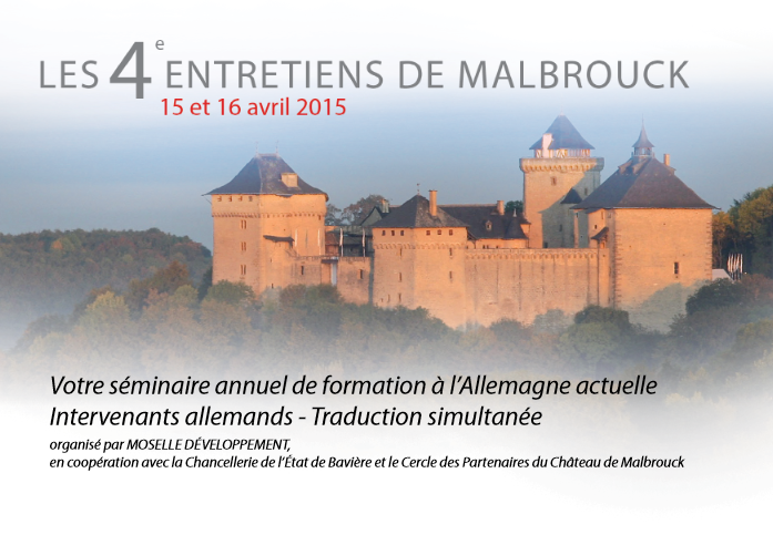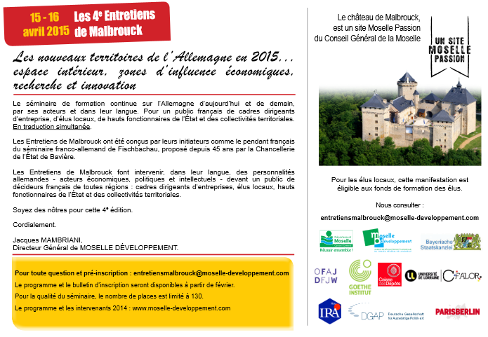 La 4ème édition des Entretiens de Malbrouck organisée par Moselle Developpement, l'OFAJ et le CFALOR et qui devait avoir lieu du 14 au 16 avril 2015 est reportée.