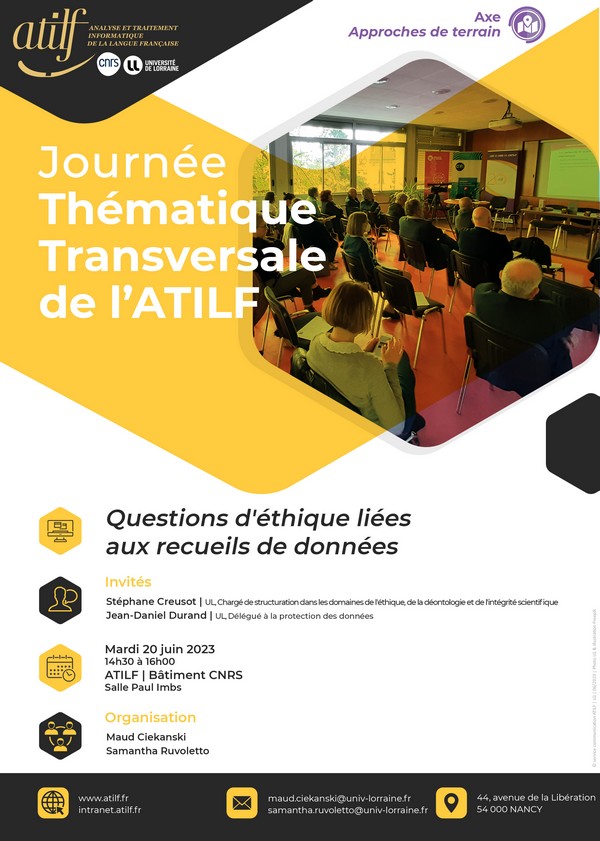L'axe Approches de terrain de l'ATILF a le plaisir de vous convier à la prochaine Journée Thématique Transversale de l'ATILF intitulée « Questions d’éthique liées aux recueils de données » qui se déroulera mardi 20 juin 2023 de 14h30 à 16h00 en salle Imbs.