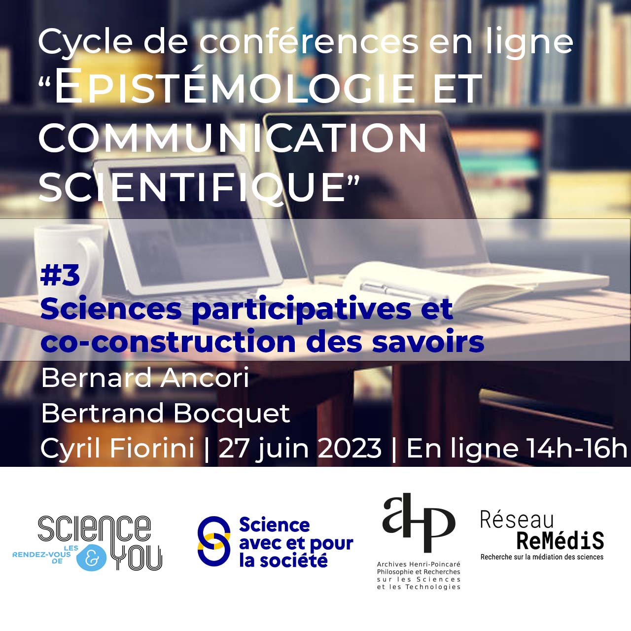 Les Archives Henri-Poincaré et l'équipe Culture, Sciences Avec et pour la Société de l'Université de Lorraine réitère son cycle de conférences initié en 2022 dans le cadre des Rendez-vous de Science & You. Ces sessions, à destination des professionnels de la communication scientifique et des personnes curieuses de comprendre ses enjeux, réunissent des épistémologues, historiens, philosophes, sociologues amenés à ouvrir le dialogue sur ces sujets. Le but de ce cycle est de décloisonner le dialogue entre communautés, confronter des manières de penser, parler de, représenter les sciences. En 2023, le réseau RéMédis (réseau de recherche en médiation des sciences) s'associe à la programmation de ces séances.