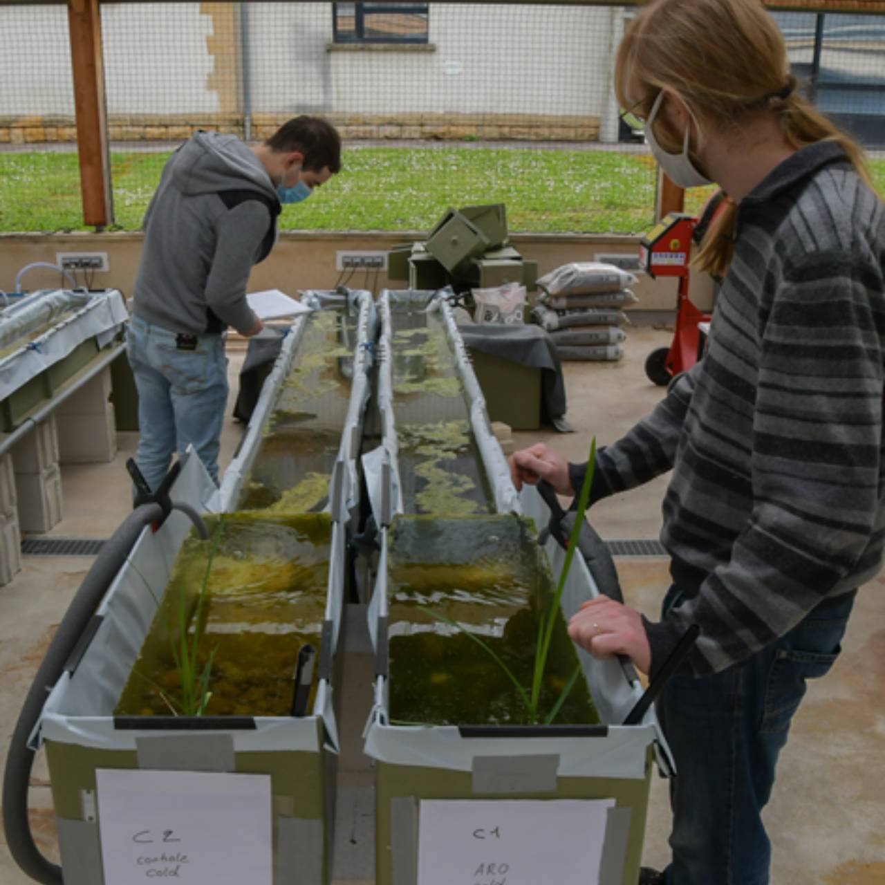 Le LiecOscope offre la possibilité de travailler avec des systèmes très simplifiés, avec un seul organisme dans un bécher, lui-même placé dans des conditions contrôlées de luminosité et de température : et dans ce cas, il est possible de multiplier le nombre d’essais et les conditions d’exposition. À l’autre extrémité du spectre, il est possible de mettre en œuvre des rivières artificielles, c’est-à-dire des canaux dans lesquels des milieux naturels plus complexes sont reconstruits (eau + sédiments + plantes + organismes vivants). Le nombre d’essais et de conditions est alors plus limité, la plateforme disposant actuellement de 18 canaux de 3m de long. Les conditions ambiantes ne sont pas contrôlées, et les systèmes sont alors soumis aux mêmes aléas climatiques que les systèmes naturels : ces dispositifs se rapprochent donc plus de la réalité du terrain. Les facteurs que nous pouvons contrôler sont moins nombreux, mais les résultats produits sont plus facilement extrapolables aux écosystèmes.
