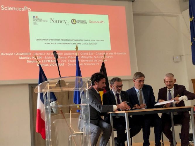 Une déclaration d'intention a été signée jeudi 31 août 2023 lors de la rentrée solennelle du Campus de Nancy de Sciences Po par l'Académie de Nancy-Metz, représentée par Richard Laganier, recteur de la Région académique Grand-Est, recteur de l’Académie de Nancy-Metz, chancelier des Universités, la Ville de Nancy, représentée par son maire Mathieu Klein, l'Université de Lorraine, représentée par Stéphane Leymarie, vice-président en charge de la stratégie territoriale et de la vie institutionnelle et Sciences Po, représenté par son directeur, Mathias Vicherat.