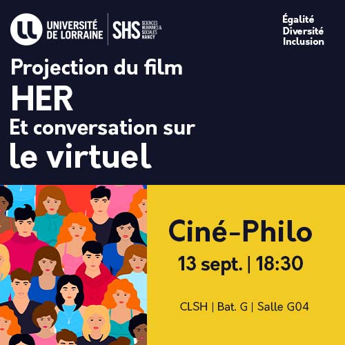 Nous montrerons le film Her (Spike Jonze, 2013), film d'anticipation où le personnage principal noue une relation forte avec une intelligence artificielle. Il a suscité une réflexion sur l'ontologie de l'amour (s'agit-il d'un vrai sentiment si nous sommes amoureux d'un être qui n'existe pas ?), sur la solitude dans un monde où la technique a pris une place essentielle. Lors de la discussion après la projection, nous voudrions nous interroger sur ces questions philosophiques, sociales et politiques en général, mais nous aimerions aussi parler de la vulnérabilité extraordinaire créée par le virtuel, touchant tout particulièrement les personnes nées après 1990, pour qui l'Internet n'est pas pensable sans les réseaux sociaux, source de joies et de créativité, mais aussi de harcèlements & d'aliénation.
