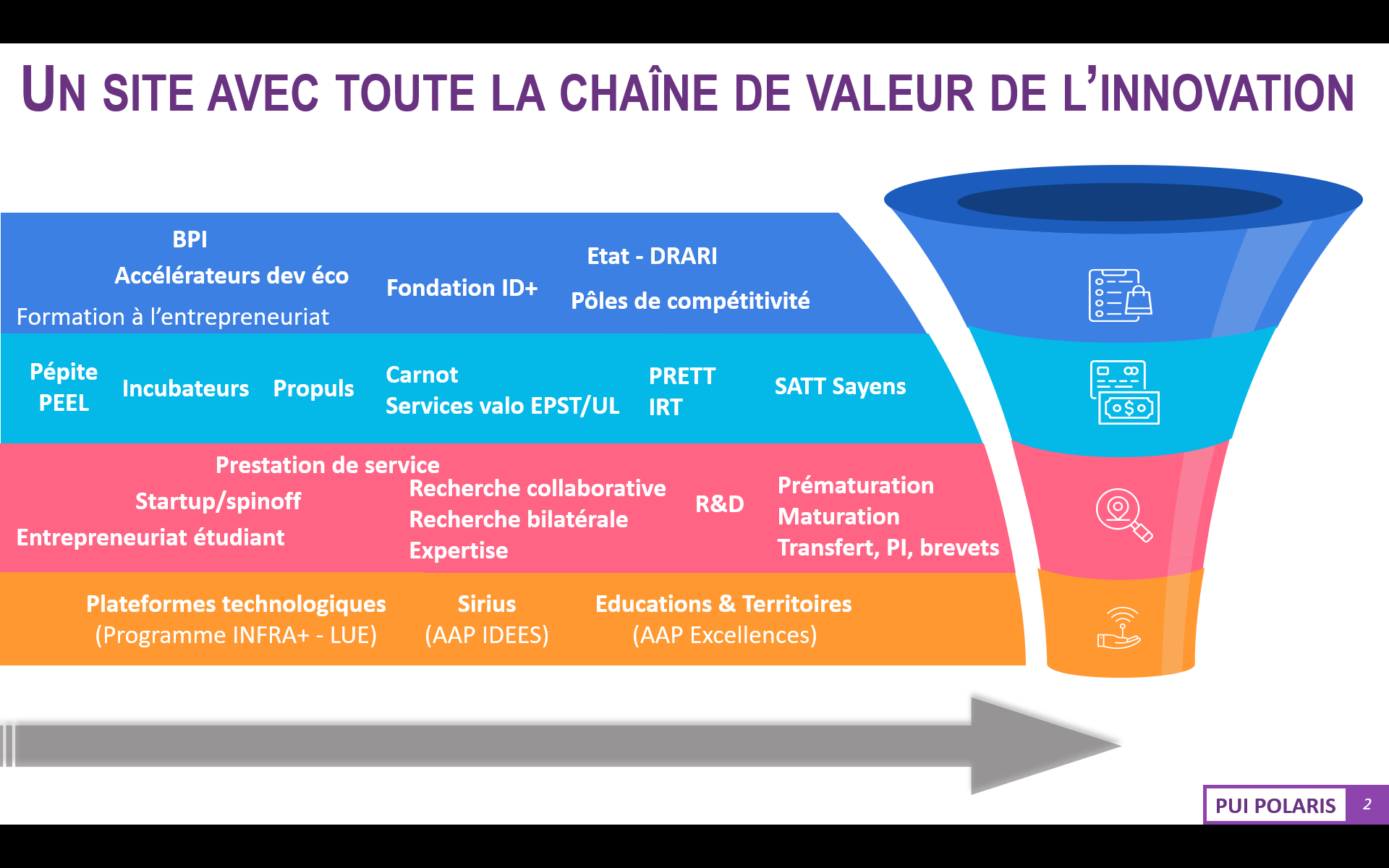 Obtenu le 10 juillet 2023, le POle Lorrain universitAire pour la Recherche et l’Innovation Socio-économique – Polaris est la réponse lorraine à l’Appel à Proposition (AAP) « Pôle Universitaire d’Innovation » qui vise à accélérer la dynamique d’innovation des écosystèmes territoriaux. Ce PUI vise à compléter le dispositif SIRIUS en mettant davantage l’accent sur la recherche partenariale. Il est doté d’un financement total de 5,7 millions d’euros sur 4 ans. Les acteurs de Polaris sont nombreux, à l’image de la chaine de valeur de l’innovation (cf. image ci-dessous), parmi eux : les opérateurs de la recherche, les structures d’aide au transfert/innovation, les entreprises/pôles de compétitivité et les pouvoirs publics.