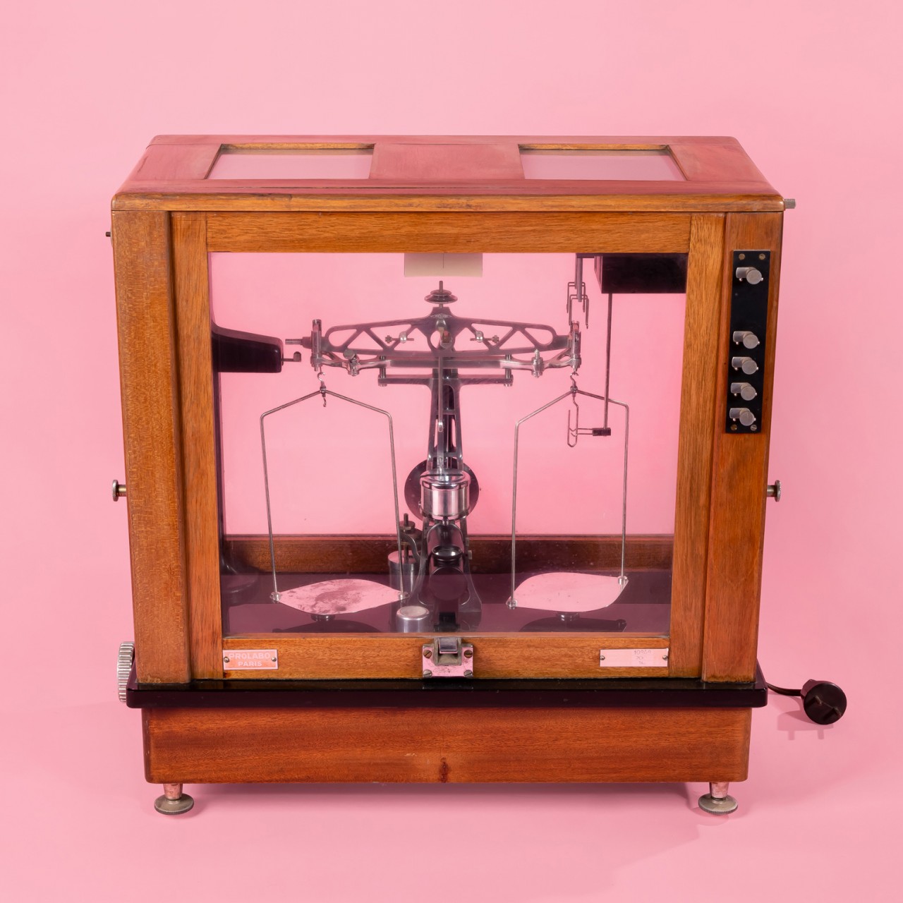 Cette balance de précision signée Prolabo est contenue dans une cage en verre pour éviter toute perturbation de la pesée. Elle était utilisée pour peser des minéraux jusqu’à 200g, avec une précision qui allait jusqu’au dixième de milligramme. Prolabo est une entreprise parisienne réputée, créée dans les années 1930, une filiale de la firme chimique Rhône-Poulenc. Ses balances de précision étaient de si bonne qualité qu’on les retrouve dans tous les laboratoires de France.