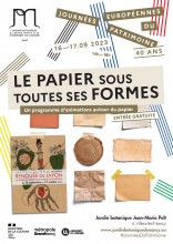 Le jardin botanique participe aux Journées européennes du patrimoine en mettant à l'honneur le papier ! Un programme d’animations originales autour des ses utilisations est proposé : découverte d'ouvrages de la flore asiatique, œuvres en papier, herbiers...