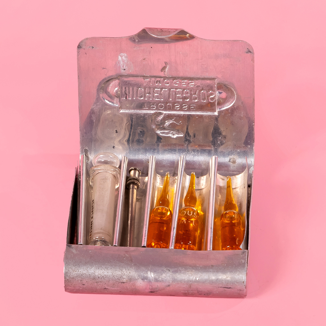 Cet étui de sérums antivenimeux contient une seringue et trois ampoules encore remplies d’une solution jaune-orangée. Le fabricant est un pharmacien basé à Limoges, Michel Legros. La recette de ce sérum, tenue secrète, date du XIXe siècle. Selon les publicités de l’époque, elle était efficace contre les morsures de serpent, contre les piqûres d’insectes ou de poissons venimeux. La présence de cet étui témoigne de l’époque où les chercheurs en minéralogie de Nancy partaient en exploration.