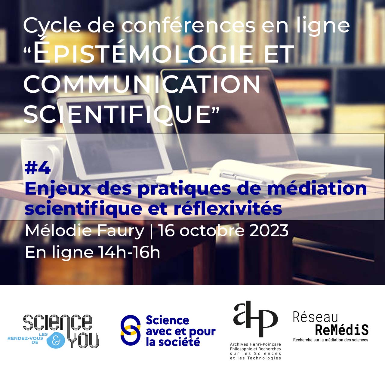 Les Archives Henri-Poincaré et l'équipe Sciences Avec et pour la Société de l'Université de Lorraine réitèrent le cycle de conférences initié en 2022 dans le cadre des Rendez-vous de Science & You. Ces sessions, à destination des professionnels de la communication scientifique et des personnes curieuses de comprendre ses enjeux, réunissent des épistémologues, historiens, philosophes, sociologues amenés à ouvrir le dialogue sur ces sujets. Le but de ce cycle est de décloisonner le dialogue entre communautés, confronter des manières de penser, parler de, représenter les sciences. En 2023, le réseau ReMédis (réseau de recherche en médiation des sciences) s'associe à la programmation de ces séances.