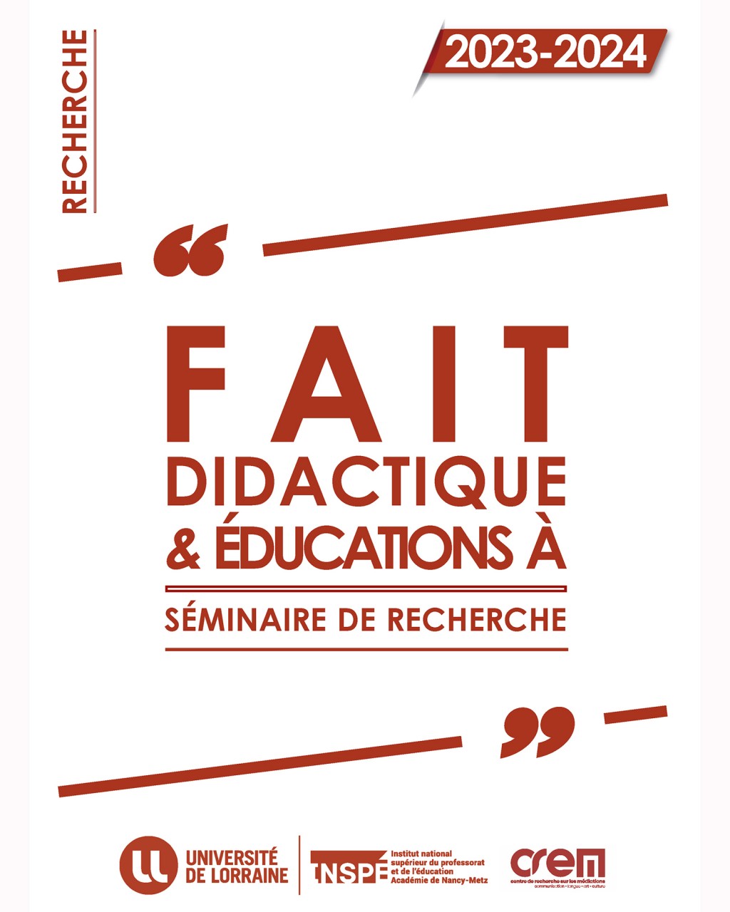 Le séminaire « Fait didactique et éducations à… » réunit depuis 2015 des chercheuses et chercheurs du CREM et d’autres laboratoires universitaires autour d’une thématique commune : les "éducations à ", fondées sur la prise en compte des questions épistémologiques liées aux savoirs en contexte éducatif (rapports sciences/société/école/territoires ; co-éducation ; cultures numériques et médiatiques, innovation pédagogique ; école/hors école). Les "éducations à" (santé, médias, numérique, développement durable…) font l’objet d’un double processus de préconisation et d’encadrement : textes internationaux d’incitation, textes nationaux d’encadrement et de prescription.