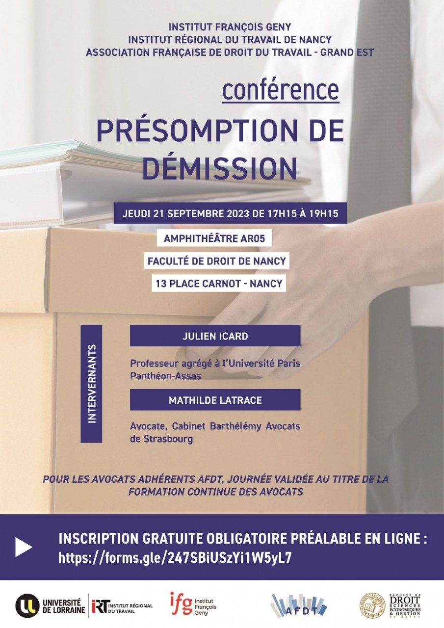 Conférence organisée dans le cadre du cycle de conférences de l'Association Française de Droit du Travail et de la Sécurité Sociale Grand Est avec le soutien et le concours de l'Institut François Geny, de l'Institut Régional du Travail Nancy et de la Faculté de Droit, Sciences économiques et Gestion de Nancy
