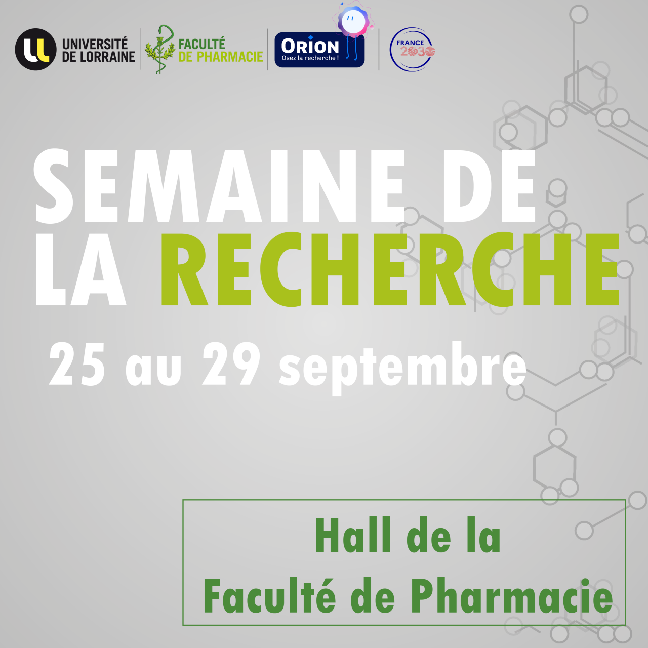 Rendez-vous du 25 au 29 septembre 2023 dans le Hall de la Faculté de Pharmacie. Toute la semaine, les enseignants-chercheurs de la Faculté vous présentent une exposition sur leurs thématiques et travaux de recherche. Vous y trouverez également des informations sur le stage d'initiation à la recherche et les différents appuis à la recherche. Des tables rondes sont proposées avec d'anciens étudiants de la Faculté, issus des filières industrie ou hôpital. Vous pourrez également discuter avec les enseignants-chercheurs le temps de la pause déjeuner, autour d'un café.