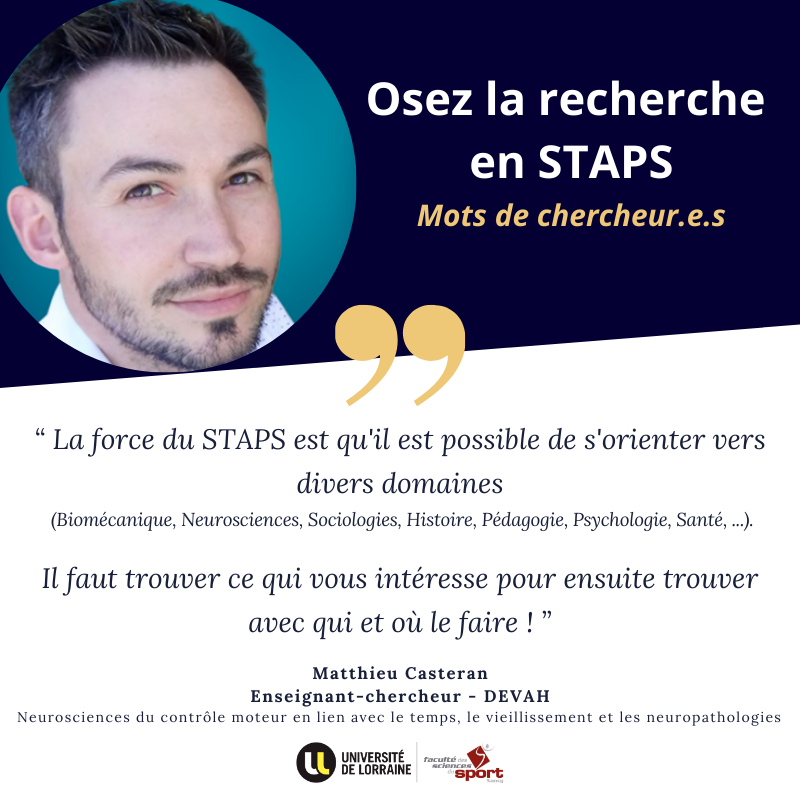 Je suis Matthieu CASTERAN, enseignant-chercheur rattaché aux laboratoires DevAH et 2LPN. J’enseigne les neurosciences (de la L1 au M2) et les outils pour l'évaluation de la performance, à la Faculté des Sciences du Sport de Nancy.