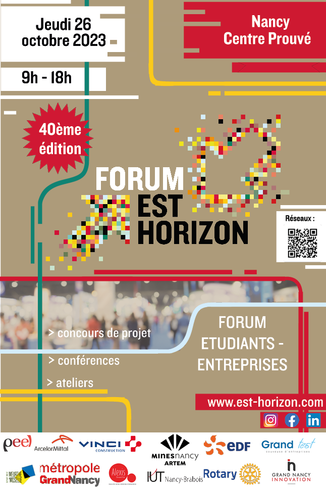 Depuis 40 ans, le Forum Est-Horizon, association pilotée par des élèves de Mines Nancy organise un forum de rencontre entre entreprises et étudiants. Il s’adresse aux étudiants de l’université de Lorraine mais pas seulement, il est aussi ouvert à l’ensemble des étudiants de France et aux personnes en recherche d’emploi.
