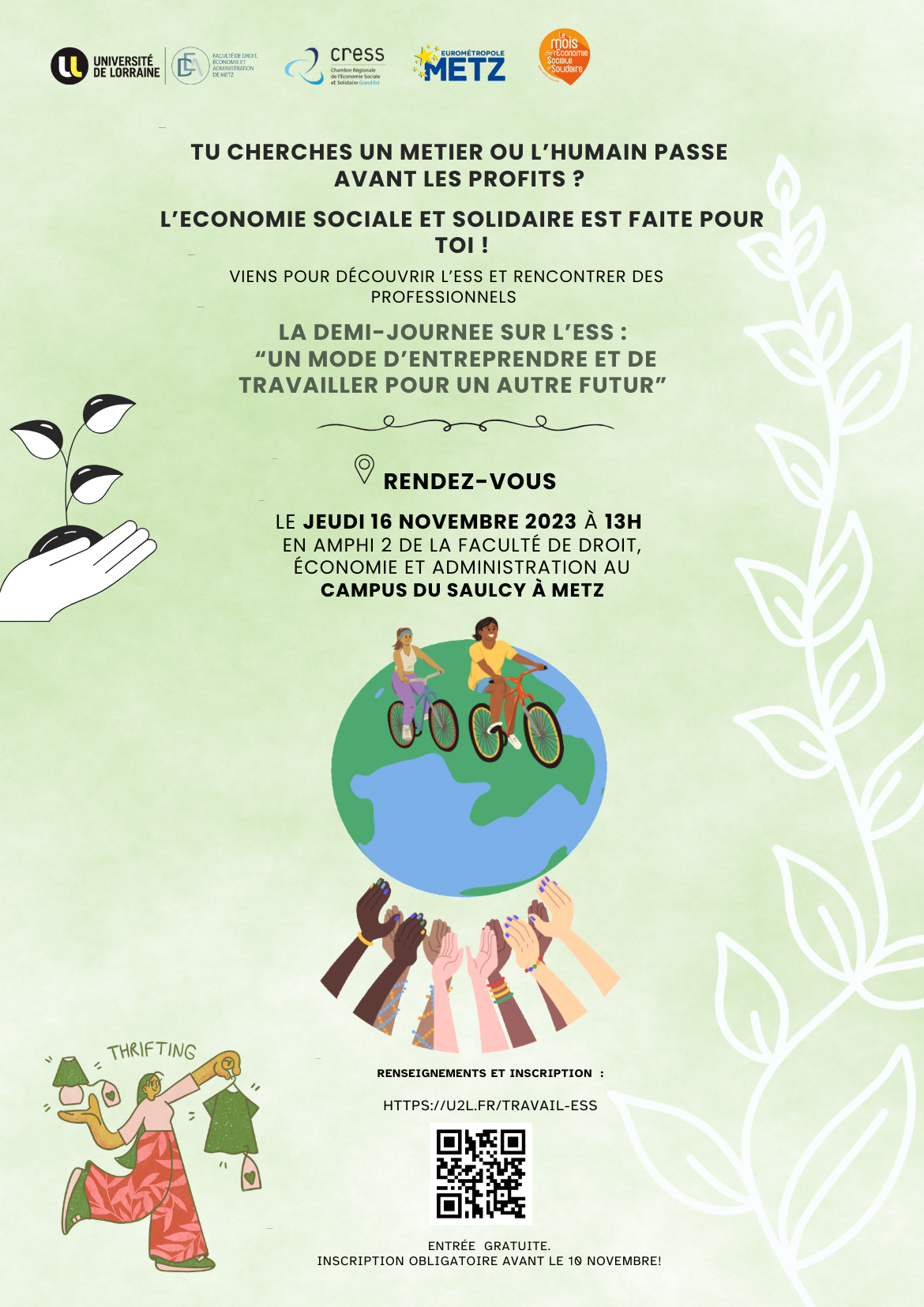 Les étudiants du Master 2 "Entreprises de l’Économie sociale et solidaire" organisent le 16 novembre à la faculté de Droit, Économie, Administration du campus Saulcy de Metz un après-midi de présentation de l’Economie Sociale et Solidaire (ESS) et de certaines de ses opportunités de carrières : "Un mode d’entreprendre et de travailler pour un autre futur".