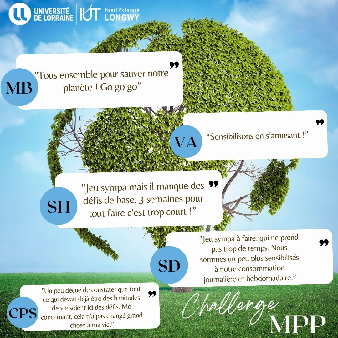 Le challenge MPP est un outil de sensibilisation et de mobilisation à la réduction de notre empreinte environnementale. Si l’Université de Lorraine a décidé de se lancer cette année dans ce challenge, c’est également parce que sa dynamique est en cohérence avec ses valeurs de responsabilité sociétale et environnementale : des défis écologiques à réaliser en équipe, ce qui favorise la cohésion, la solidarité et l’inclusion.