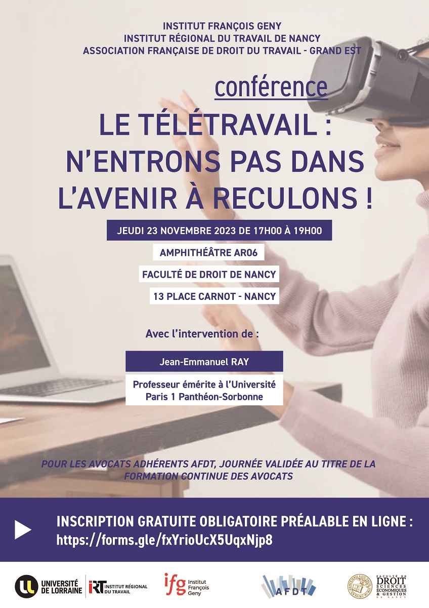 Conférence organisée dans le cadre du cycle de conférences de l'Association Française de Droit du Travail et de la Sécurité Sociale Grand Est avec le concours de l'Institut François Geny, de l'Institut Régional du Travail Nancy et de la Faculté de Droit, Sciences économiques et Gestion de Nancy