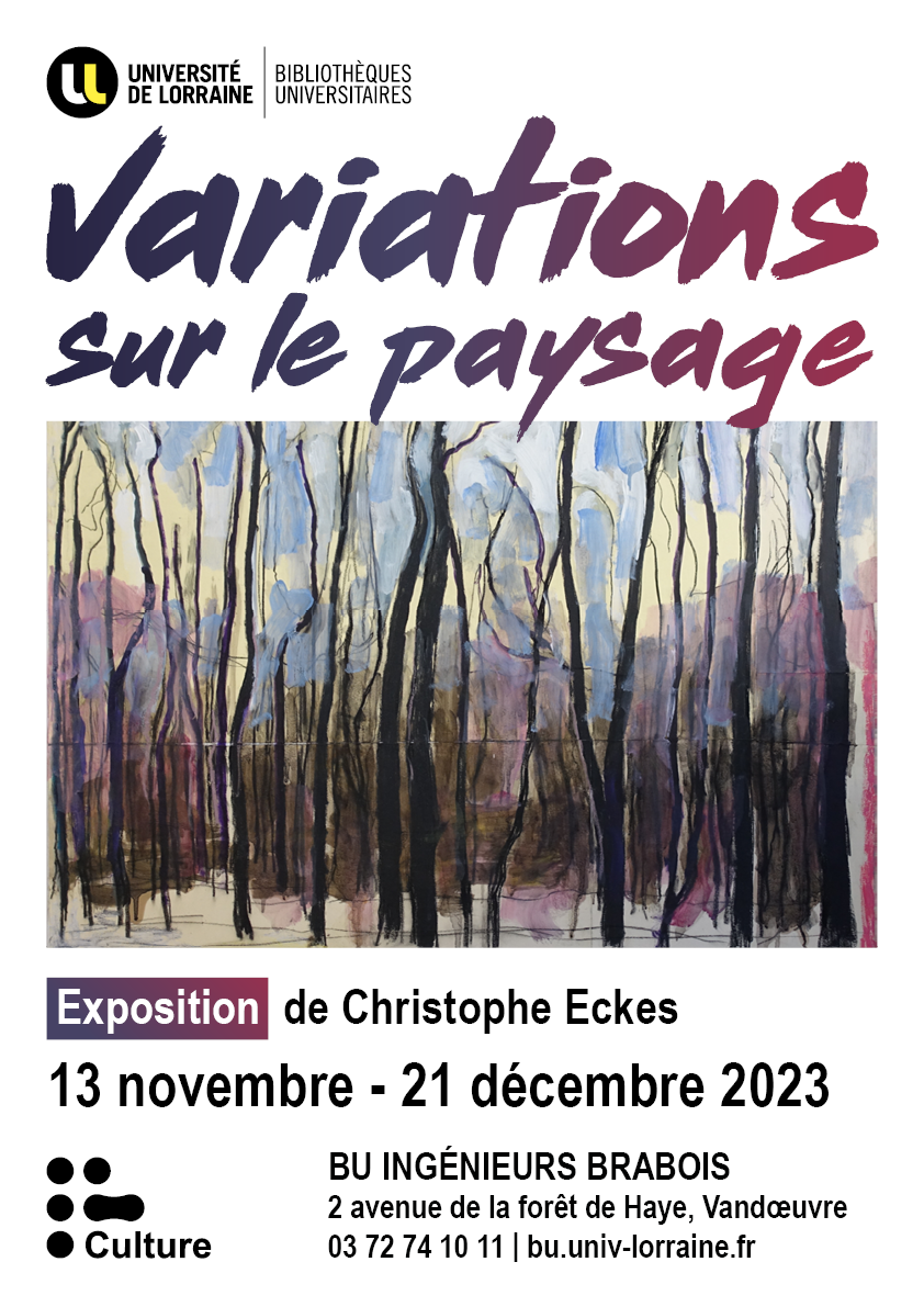 La bibliothèque Ingénieurs Brabois vous invite à découvrir l'exposition "Variations sur le paysage" du 13 novembre au 21 décembre 2023. Christophe Eckes, artiste plasticien, maître de conférences à l'Université de Lorraine, spécialisé en histoire des mathématiques et rattaché aux Archives Henri-Poincaré, y présente ses travaux autour de la thématique du paysage.
