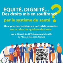 La crise du système de santé questionne profondément notre société. Avec cette thématique en fil conducteur, le Conseil de développement durable (CODEV) de l’Eurométropole de Metz se place du point de vue de l’usager-citoyen. À travers un cycle de conférences et tables rondes ouvertes à tous, il s’interroge sur la réalité du terrain.
