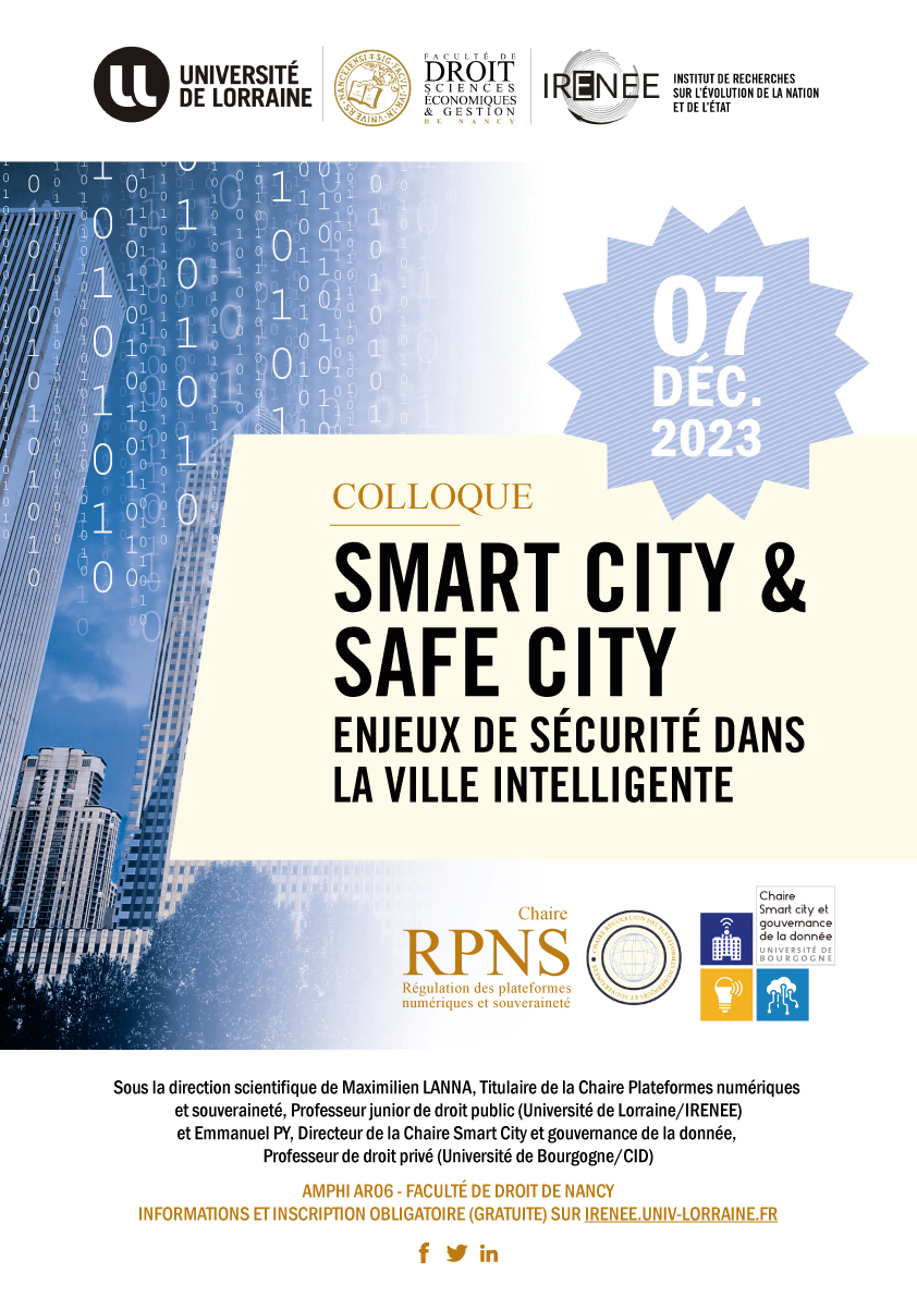 Le colloque organisé le 7 décembre 2023 à la Faculté de droit de Nancy, fruit d’un partenariat entre la Chaire Régulation des plateformes numériques et souveraineté (Université de Lorraine/IRENEE) et la Chaire Smart City & Gouvernance de la donnée (Université de Bourgogne/CID) entend proposer une analyse croisée de ces problématiques. Outre l’étude des enjeux relatifs à la cybersécurité au sein des villes, cet évènement permettra d’interroger le cadre juridique relatif à la surveillance ainsi que les limites qui y sont aujourd’hui apportées.