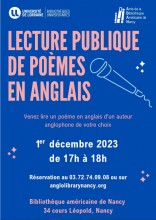 La Bibliothèque américaine de Nancy propose pour la première fois une lecture publique de poèmes en anglais, vendredi 1er décembre de 17h à 18h.
