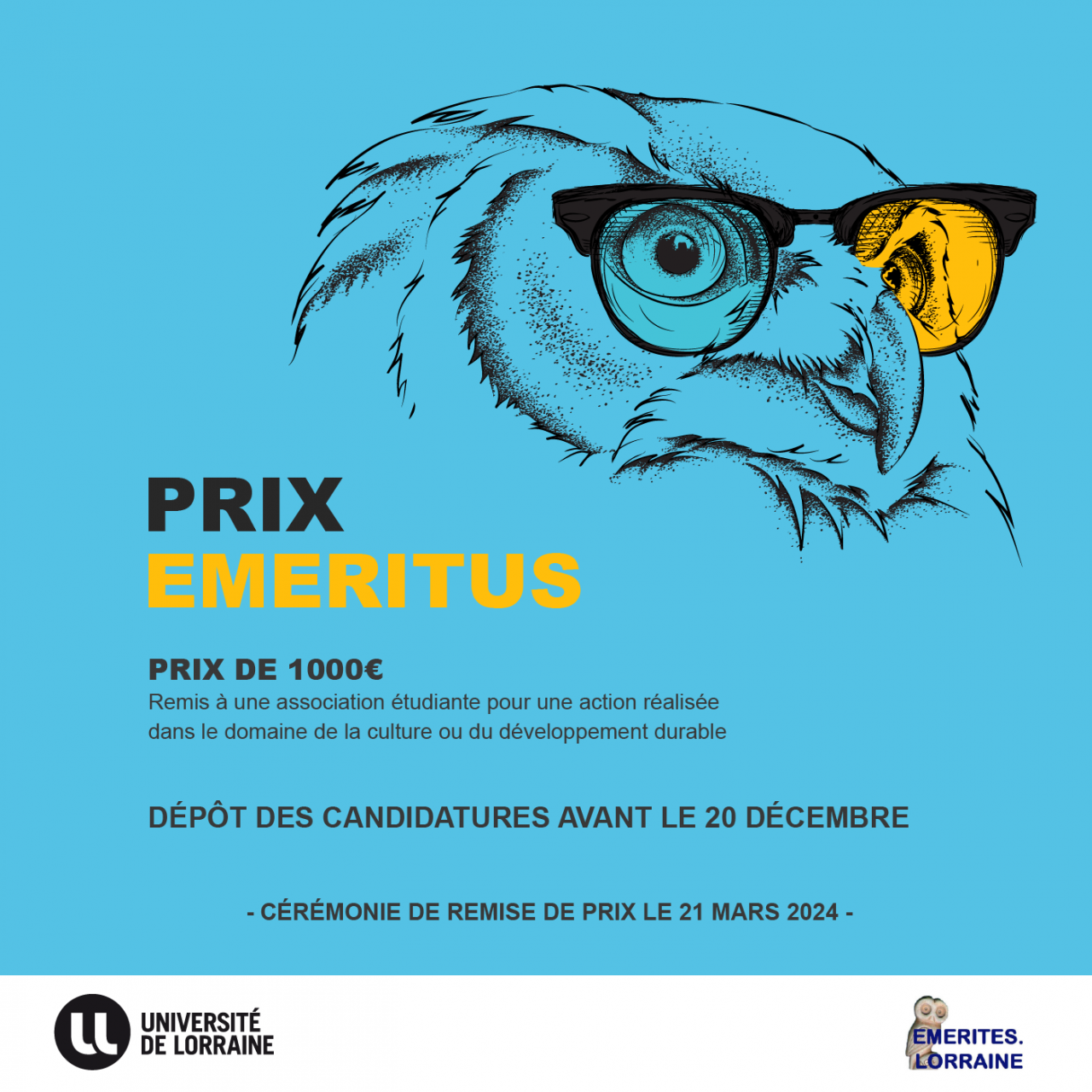 L'association Émérites.Lorraine et l'Université de Lorraine s'associent pour lancer le Prix Emeritus, qui vise à récompenser des initiatives étudiantes particulièrement remarquables dans le domaine de la culture ou du développement durable. Le prix 2023, d'un montant de 1000 €, sera décerné en mars 2024 lors de l'assemblée générale de l'association.