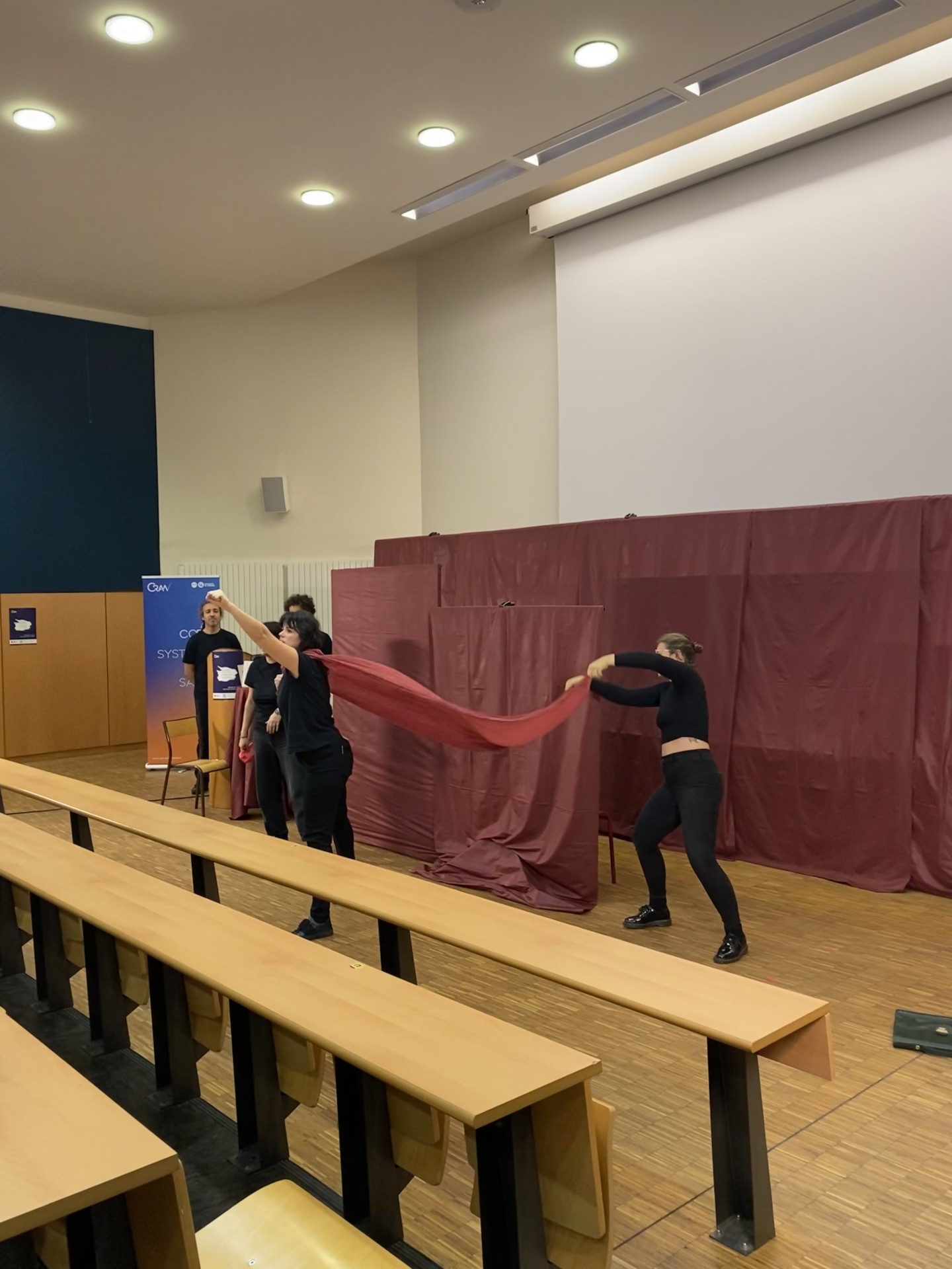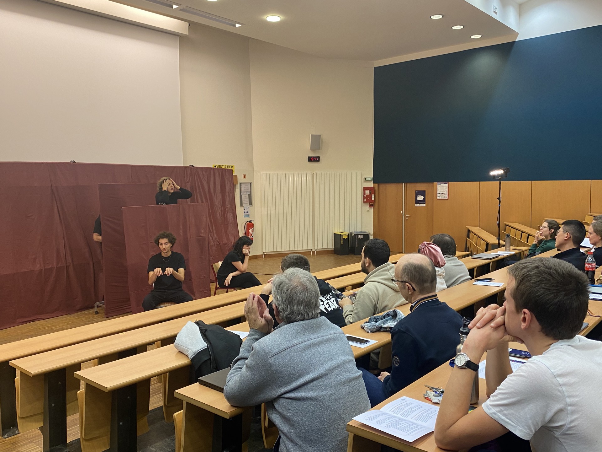 L'évènement a débuté avec la Compagnie théâtrale Entrées de Jeu, spécialisée dans les débats théâtraux, où cinq acteurs ont interprété treize saynètes reflétant des situations quotidiennes dans lesquelles les questions de parité émergent, parfois à notre insu. Les spectateurs, qui se sont reconnus dans l'une ou l'autre de ces saynètes, ont ensuite été invités à rejouer certaines scènes en modifiant les dialogues pour montrer comment ils auraient réagi dans cette situation.