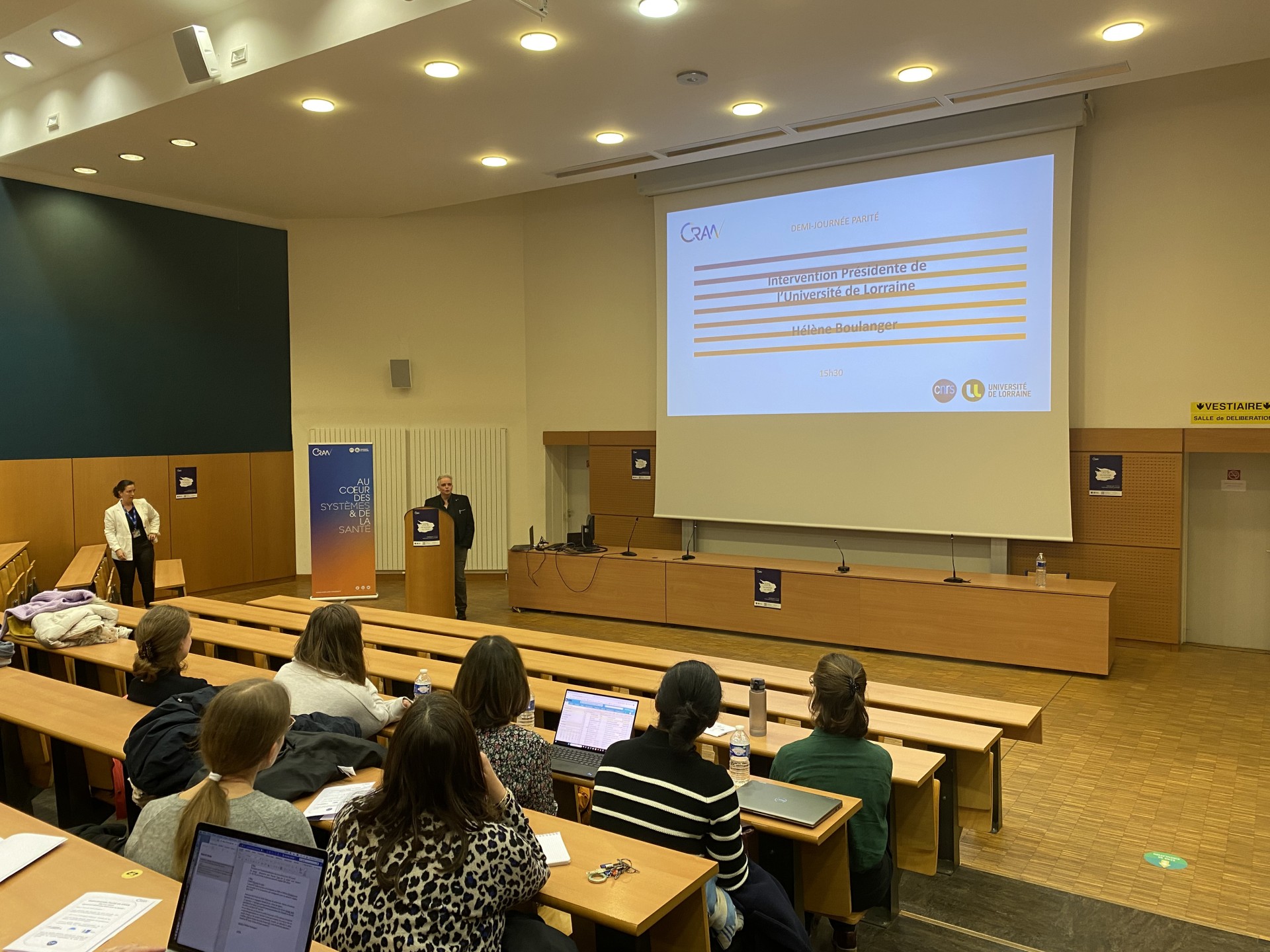 La Présidente de l'Université de Lorraine, Hélène Boulanger, ainsi que le Vice-Président en charge de l'Égalité-Diversité-Inclusion, Pascal Tisserant, sont intervenus pour rappeler que la parité fait partie des causes défendues par l'Université de Lorraine.