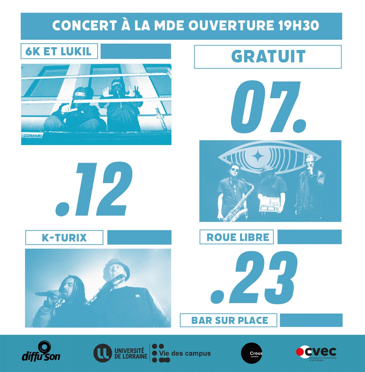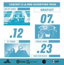 - 21h : Roue Libre : collectif/groupe de musique indépendant basé dans le Grand-Est composé de 3 membres NARBO, CRAKK TEMPO et SNEF. Le nom n'a pas été choisi au hasard : c'est la liberté de création, le mélange et la fusion des styles musicaux qui sont mis à l'honneur au sein de ROUE LIBRE.
