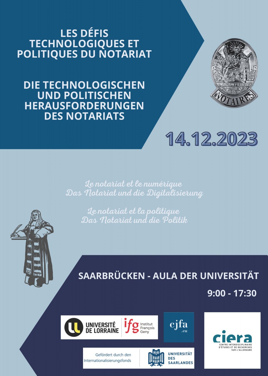 Ce colloque constitue le dernier volet du projet "Approche interculturelle du notariat latin : perspectives franco-allemandes" mené, sous la responsabilité du professeur Paul Klötgen (Institut François Geny, Université de Lorraine), avec le soutien du programme de formation-recherche (PFR) du Centre Interdisciplinaire d’études et de Recherches sur l’Allemagne (CIERA).