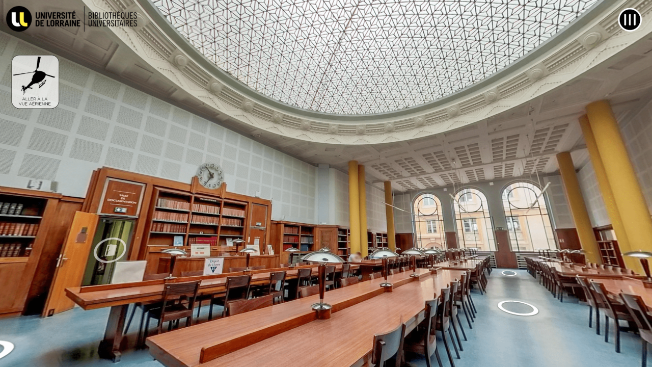 Les visites virtuelles donnent accès à des espaces interdits au public, comme les abris anti-aériens de la BU Droit & Sciences économiques à Nancy ou la réserve patrimoniale de la BU Lettres & SHS de Nancy. Elles permettent également de se déplacer dans les espaces et de s’attarder à certains points d’intérêt où il est possible d’accéder à des informations supplémentaires pour comprendre l’histoire architecturale du lieu visité.