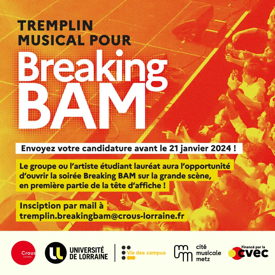 Avant le 21/01/2024, envoyez votre candidature par mail à l’adresse tremplin.breakingbam@crous-lorraine.fr :