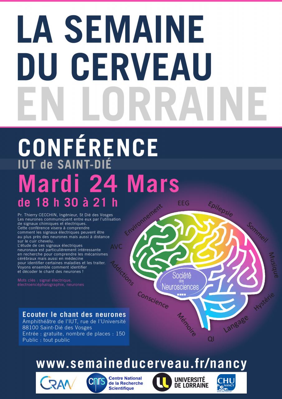 Une conférence donnée par le Pr. Thierry CECCHIN, Ingénieur, aura lieu pendant "La semaine du Cerveau" le 24 mars 2015 à St Dié des Vosges.