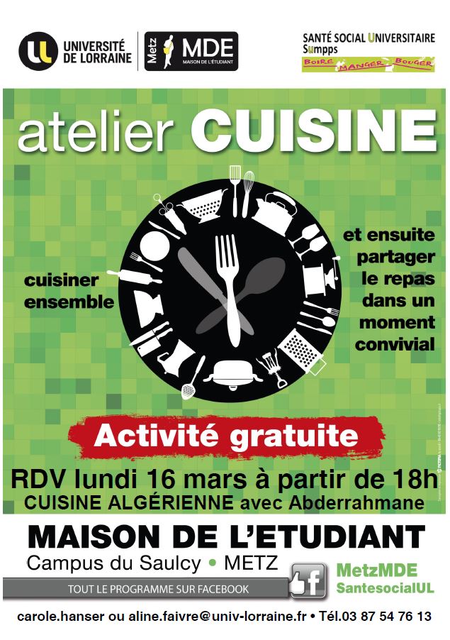 Le Sumpps propose aux étudiants de l'#universitedelorraine un atelier cuisine algérienne ce lundi 16 mars. Cet atelier est co-animé par la diététicienne du Sumpps qui vous accompagne dans la préparation de votre menu rapide, pas cher et avec les moyens matériels dont peut disposer un étudiant, et une animatrice de la MDE.